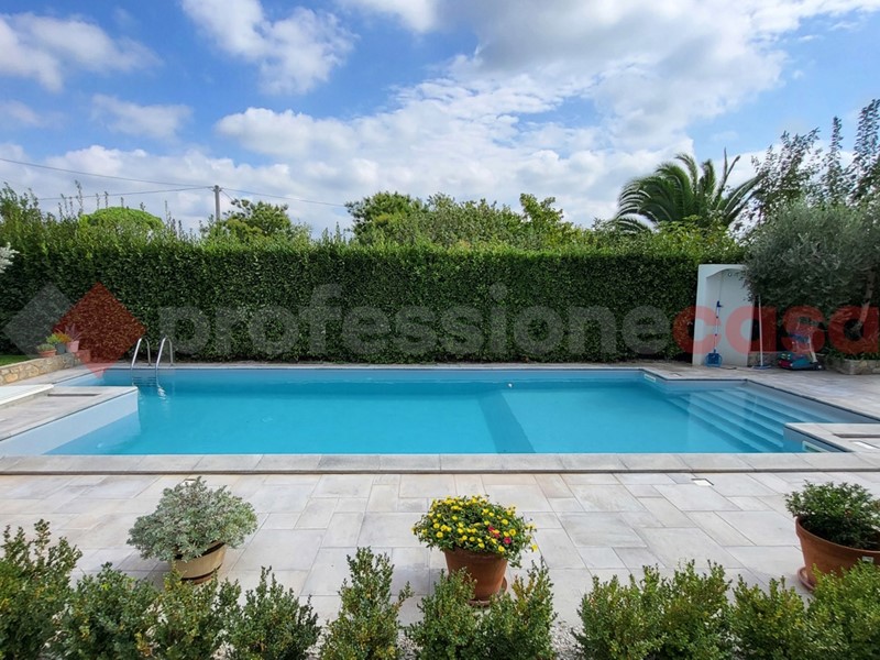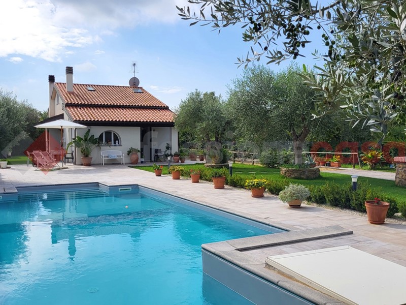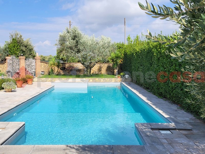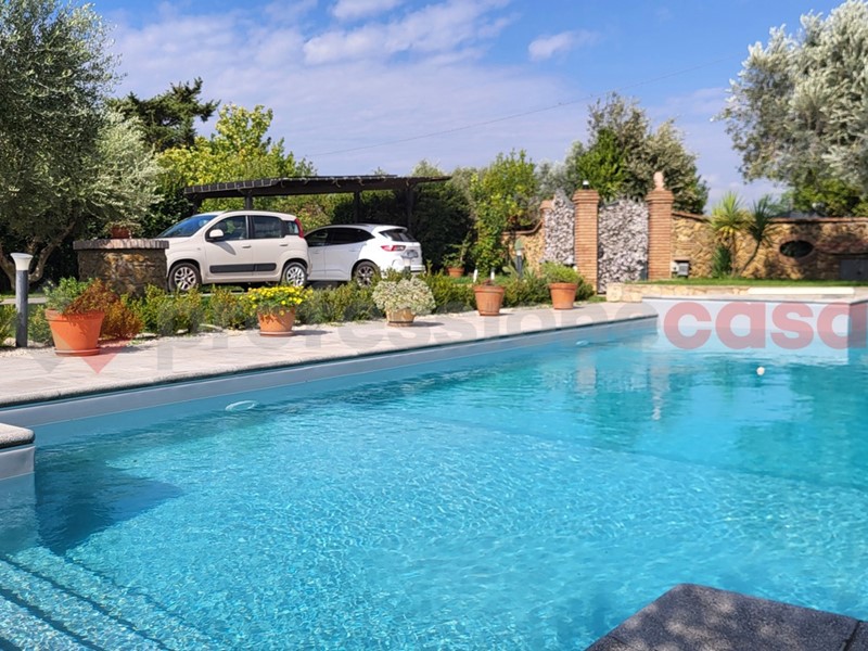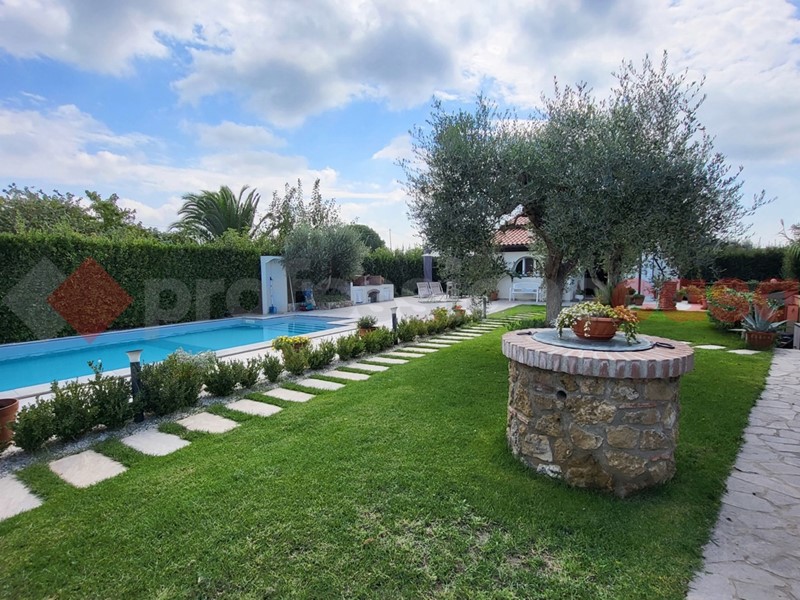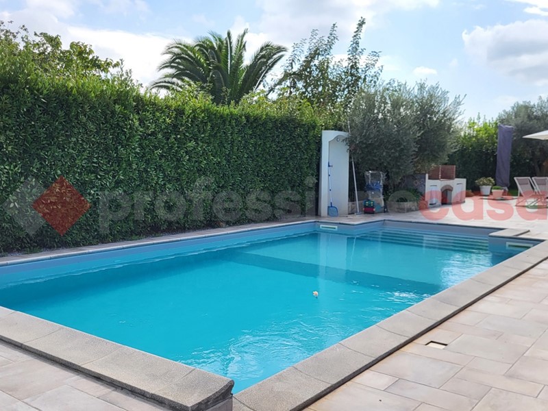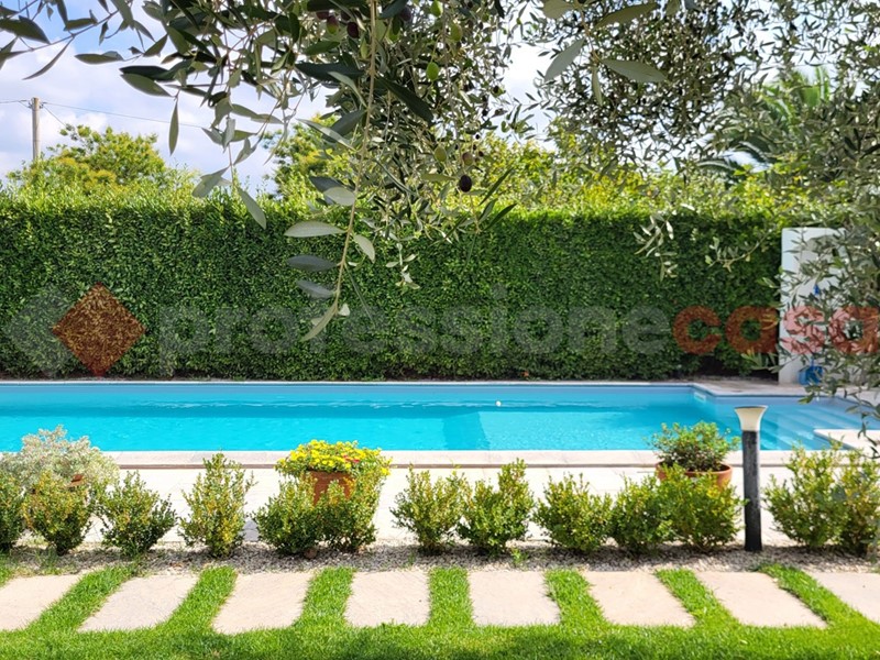 Una volta varcata la soglia del cancello in ferro battuto ci troviamo in una vera oasi di comfort e eleganza con un parco perfettamente tenuto circondato da una fitta siepe di allori, splendide piante di olivi ed altre essenze floreali, un grande solarium che circonda la piscina fino ad unirsi alla villa per momenti di relax e divertimento, un bellissimo ed utile pozzo privato dove attingere acqua per uso domestico, per la piscina e l'irrigazione automatica del giardino, posti auto scoperti ed altri coperti da una tettoia con sovrastante fotovoltaico, una utile casina in legno per il ricovero degli attrezzi.