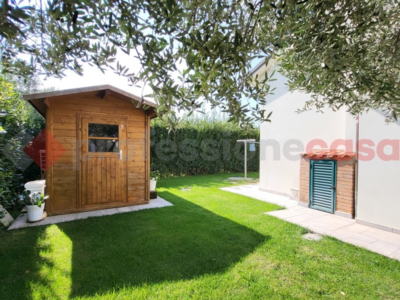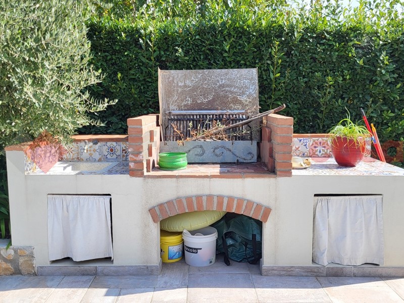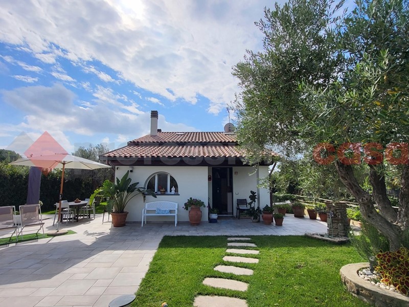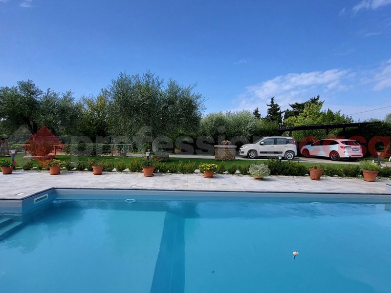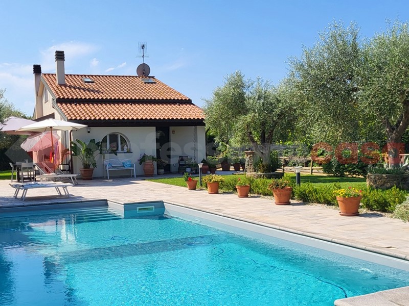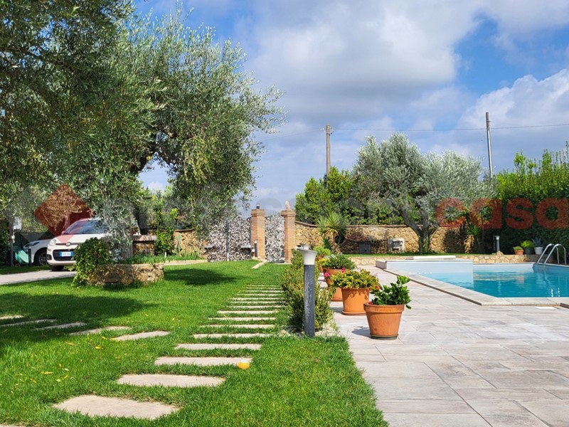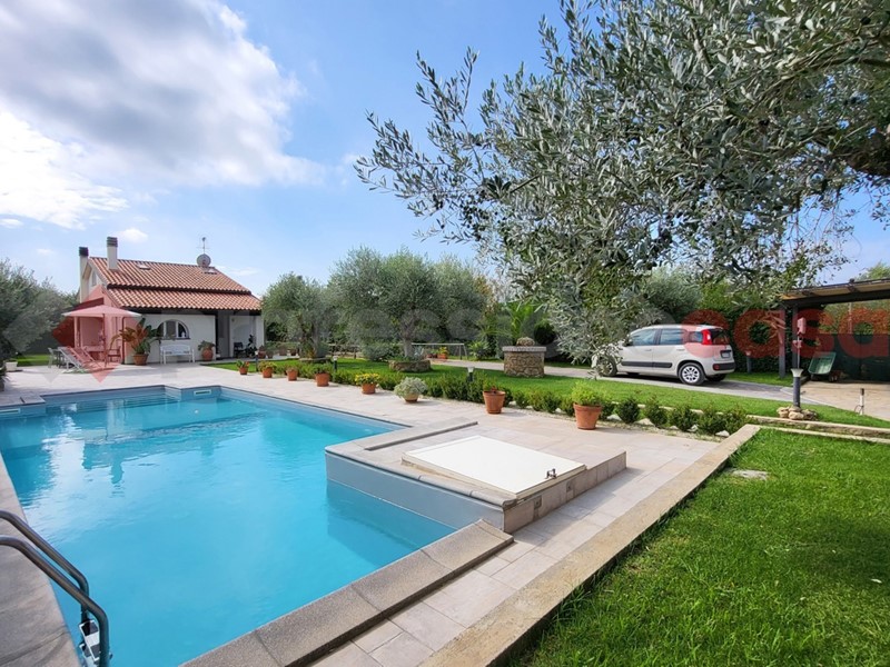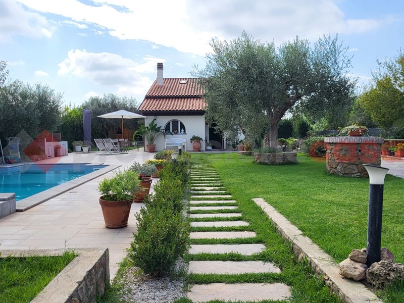 Una volta varcata la soglia del cancello in ferro battuto ci troviamo in una vera oasi di comfort e eleganza con un parco perfettamente tenuto circondato da una fitta siepe di allori, splendide piante di olivi ed altre essenze floreali, un grande solarium che circonda la piscina fino ad unirsi alla villa per momenti di relax e divertimento, un bellissimo ed utile pozzo privato dove attingere acqua per uso domestico, per la piscina e l'irrigazione automatica del giardino, posti auto scoperti ed altri coperti da una tettoia con sovrastante fotovoltaico, una utile casina in legno per il ricovero degli attrezzi.