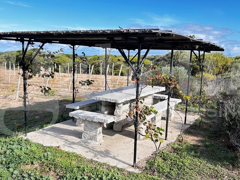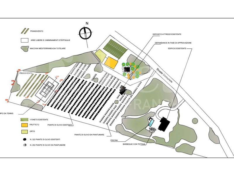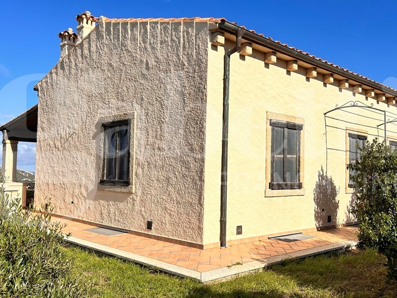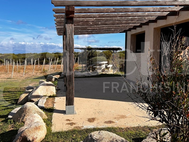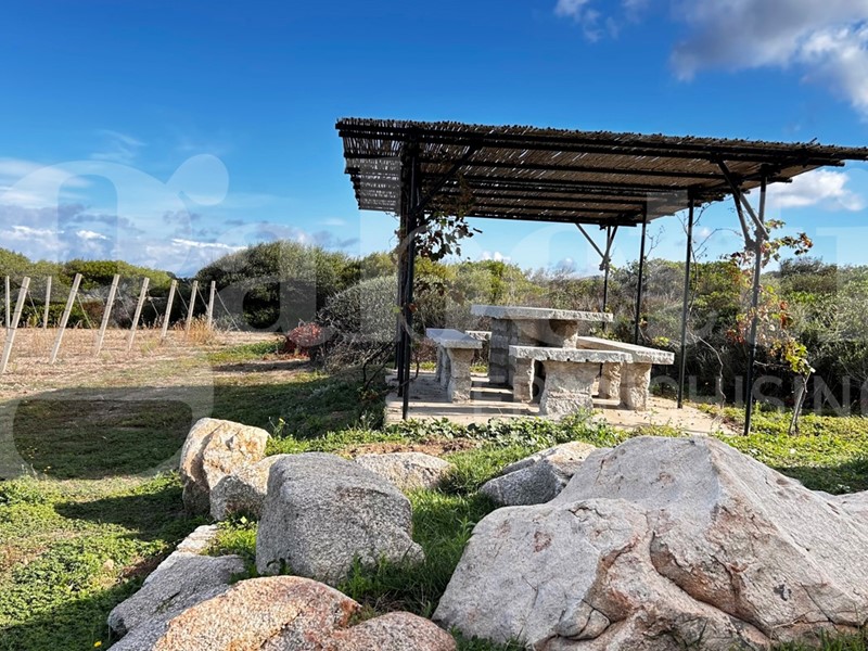 Gli esterni della proprietà sono circondati da un ampio prato verde, irrigato automaticamente e decorato da essenze mediterranee come pitosfori, mirti e olivastri. Oltre alla vegetazione spontanea che arricchisce il paesaggio, il terreno ospita un vigneto con 400 ceppi e un oliveto di 280 piante, entrambi già produttivi, che donano ulteriore valore alla proprietà.