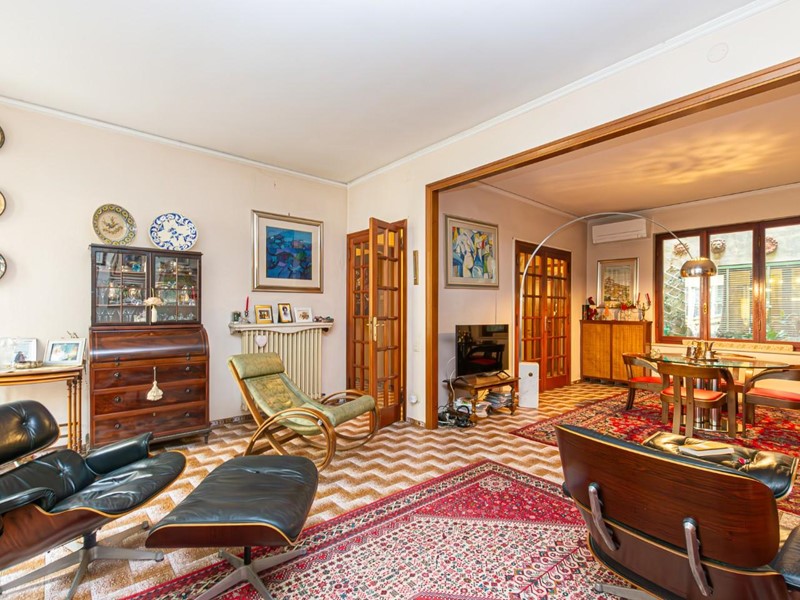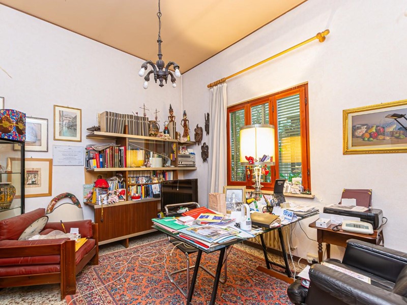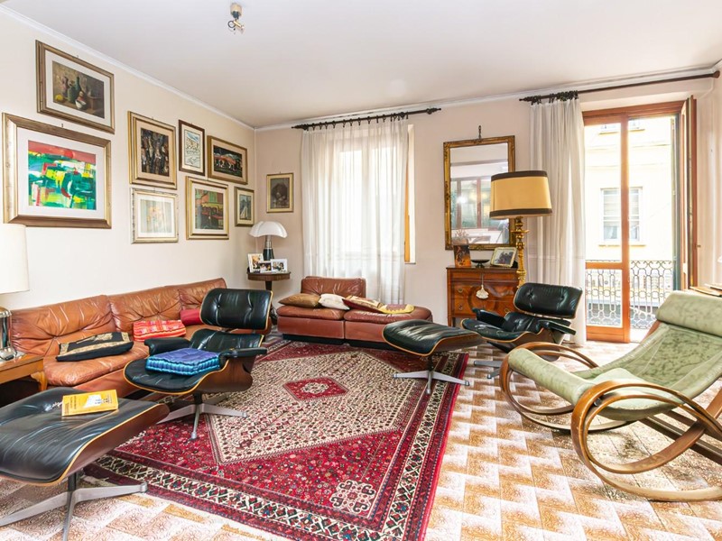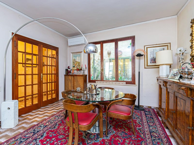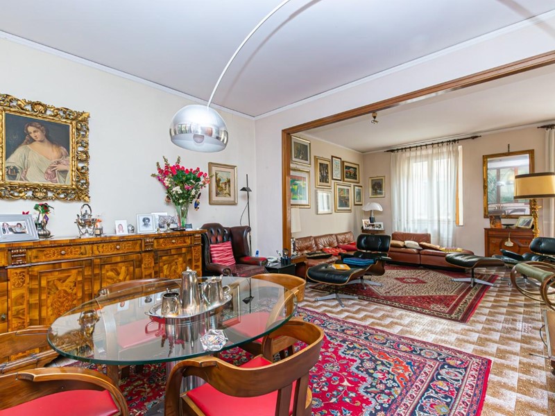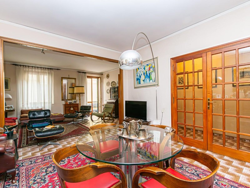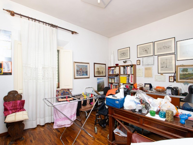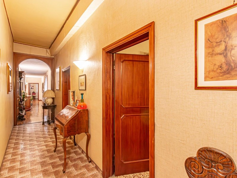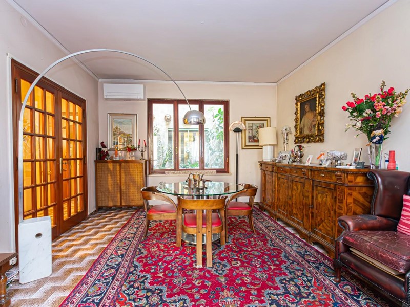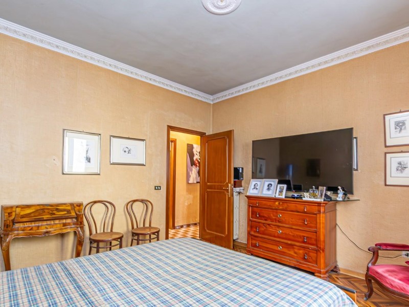 La proprietà, unica al piano e con una funzionale distribuzione interna degli spazi, è composta da ingresso, doppio salone con terrazza, cucina, sala da pranzo, tre grandi camere da letto, uno studio, due bagni, una bellissima chiostra interna e altra terrazza sul lato nord. L’immobile risulta essere molto luminoso. La planimetria, estremamente versatile, consente una distribuzione degli spazi facilmente adattabile ad ogni personale esigenza. La soluzione si presenta in ottime condizioni manutentive, con finiture d’epoca, pavimentazione in parquet, marmo e ceramica, infissi originali in legno, soffitti alti 3 mt., riscaldamento autonomo.