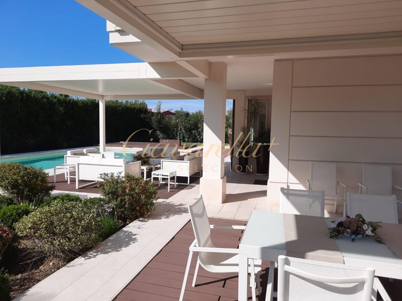 Internamente composta da: al piano terra grande soggiorno, sala da pranzo, cucina e ampie verande con zona pranzo e salotto esterno, una grande suite con salotto e un bagno con doccia. Piano primo: tre camere da letto matrimoniali con tre bagni e grande terrazza.