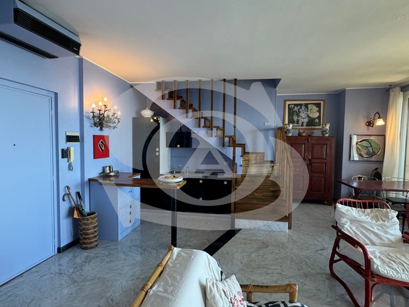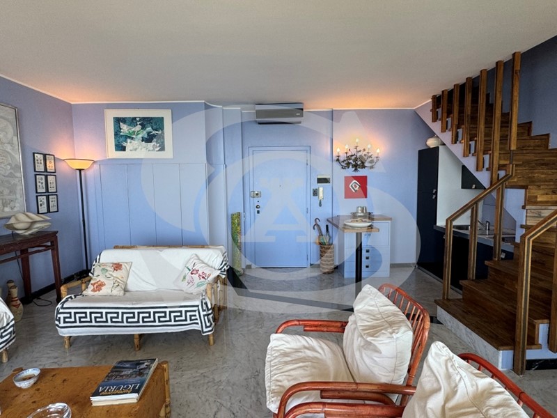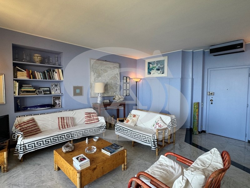 Si accede all'appartamento con ingresso su zona giorno luminosa ed ampia organizzata in soggiorno ed angolo cottura a vista con ampie vetrate da cui si gode di una vista aperta e panoramica sul mare;