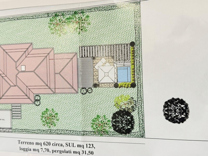 La villa si presenta su terreno di circa mq 620 con spazio esterno dedicato alle auto con accesso carrabile e pedonale.