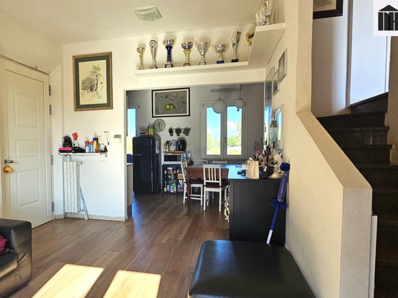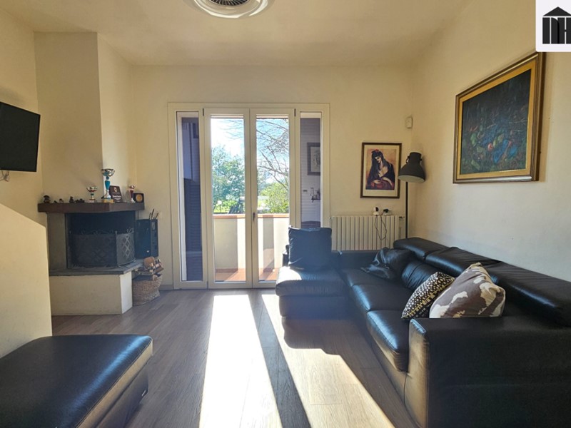Entrando dal portone principale ci accoglie un luminoso soggiorno con camino e una cucina abitabile, da entrambi è possibile accedere, tramite porta-finestra, ai due balconi.
