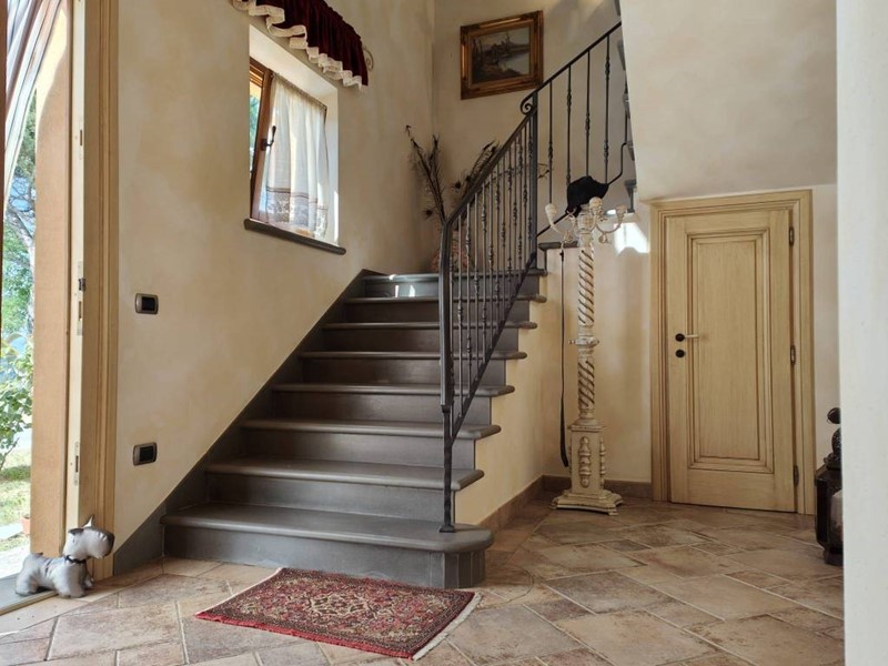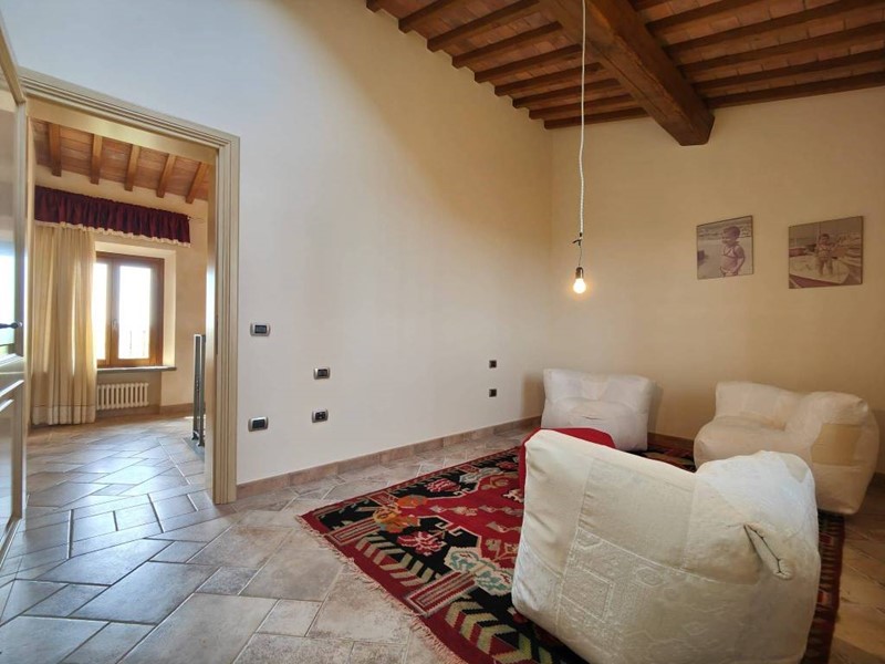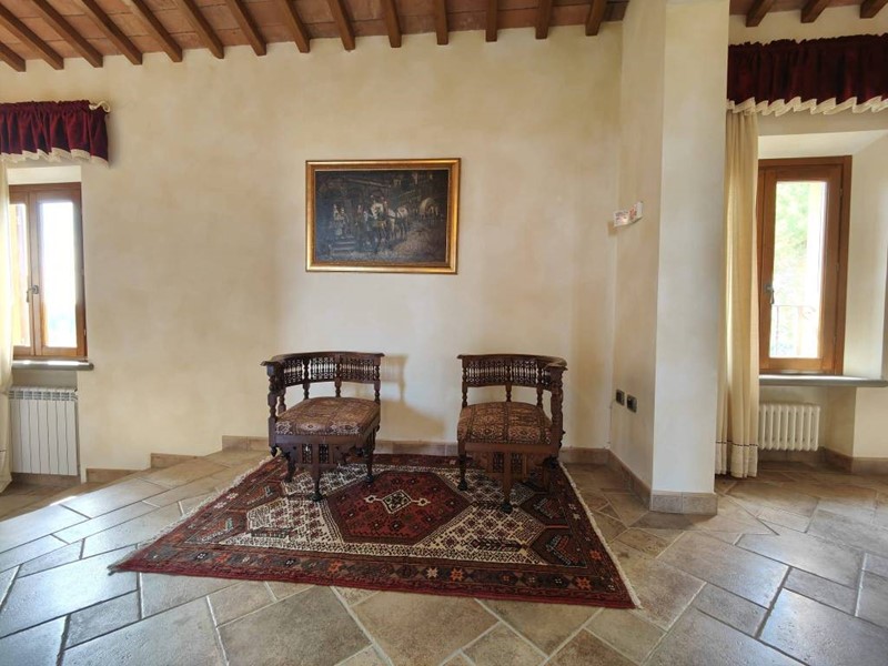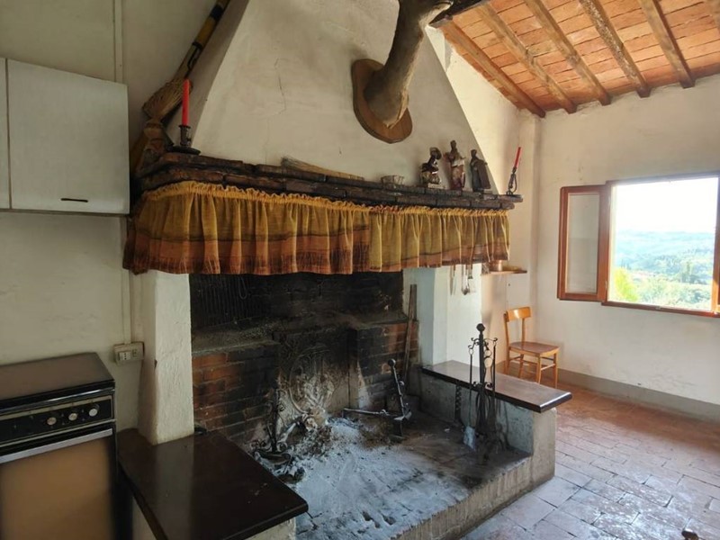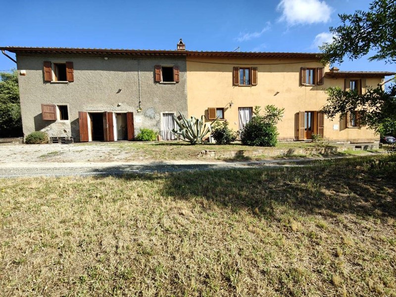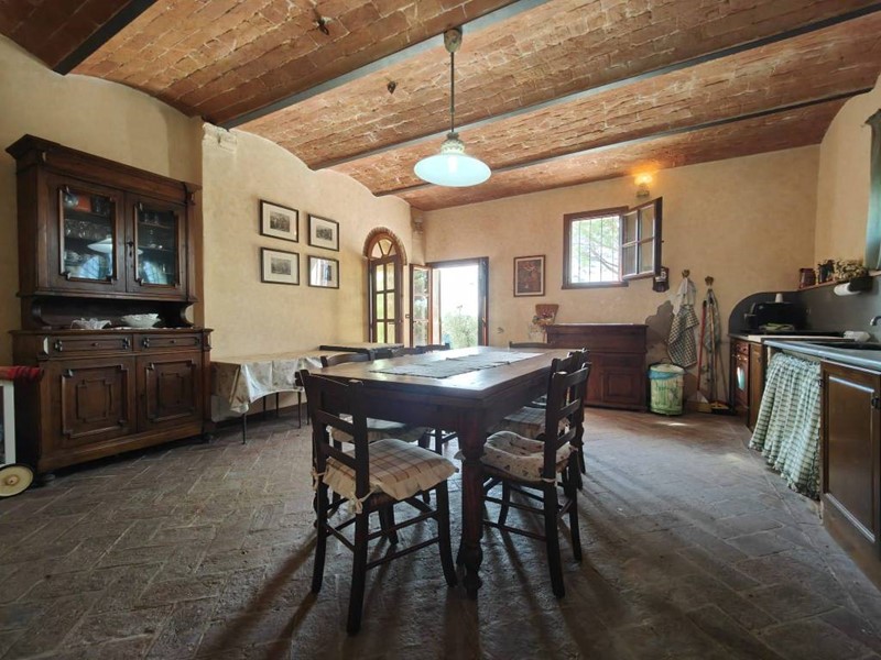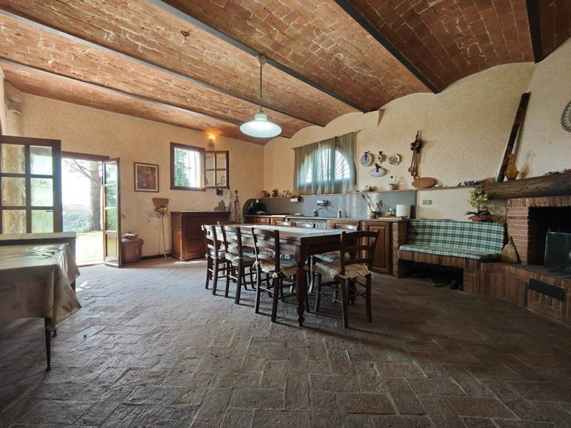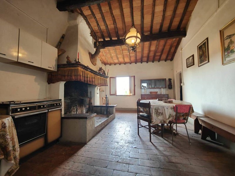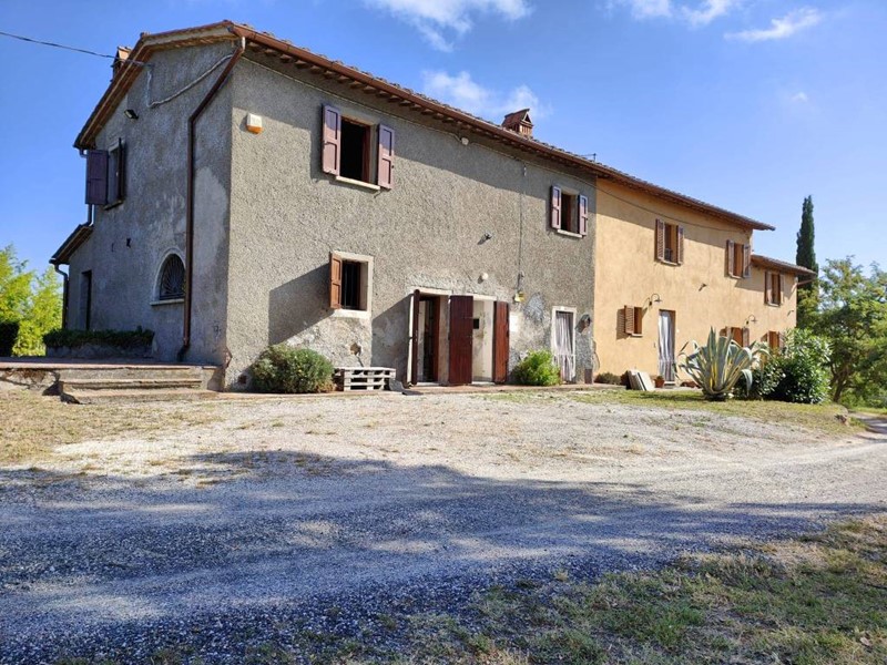 Una colonica composta da due unità abitative, con una vista panoramica invidiabile, giardino, possibilità di costruire una piscina e ampio appezzamento di terreno di circa 5 ettari con diverse destinazioni come uliveto, vigneto, seminativo, pascolo e boschivo.
