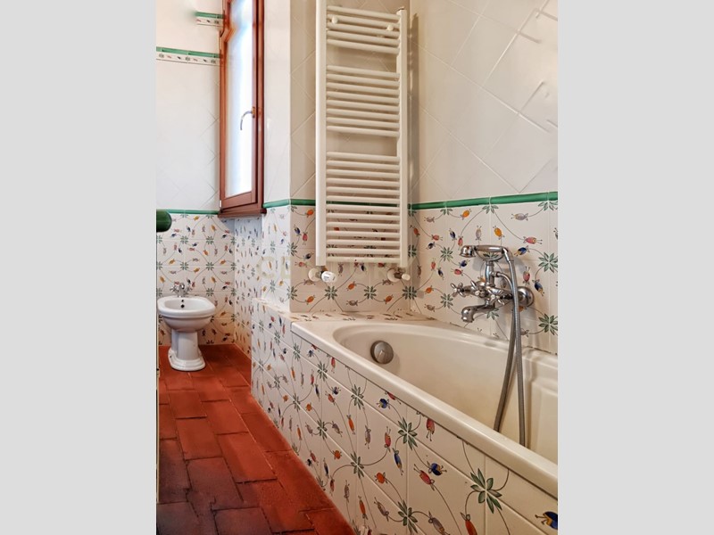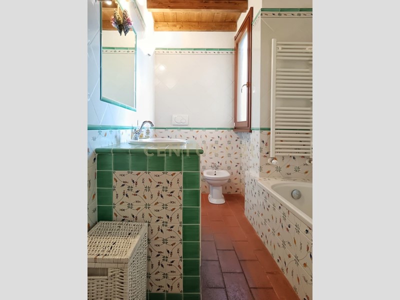 Salendo al primo piano, l’appartamento conquista con il suo soffitto a travi a vista, i pavimenti in cotto e un’atmosfera calda e accogliente: l’ampio soggiorno con angolo cottura ospita un caratteristico camino in pietra intagliata a mano e un terrazzino panoramico con vista mozzafiato sulla campagna toscana.