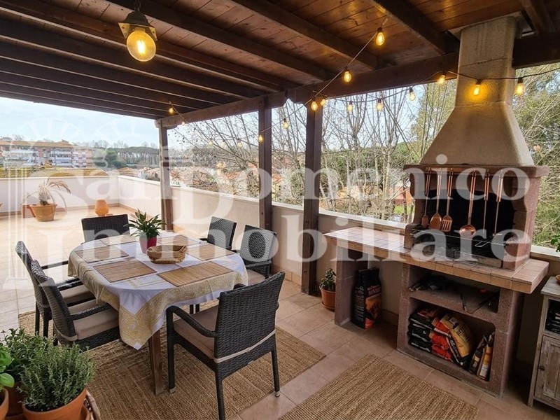 L'ampia terrazza , vero pregio di questo appartamento, é dotata di due grandi tende meccaniche che ne garantiscono la fruibilità con qualsiasi condizione metereologica.