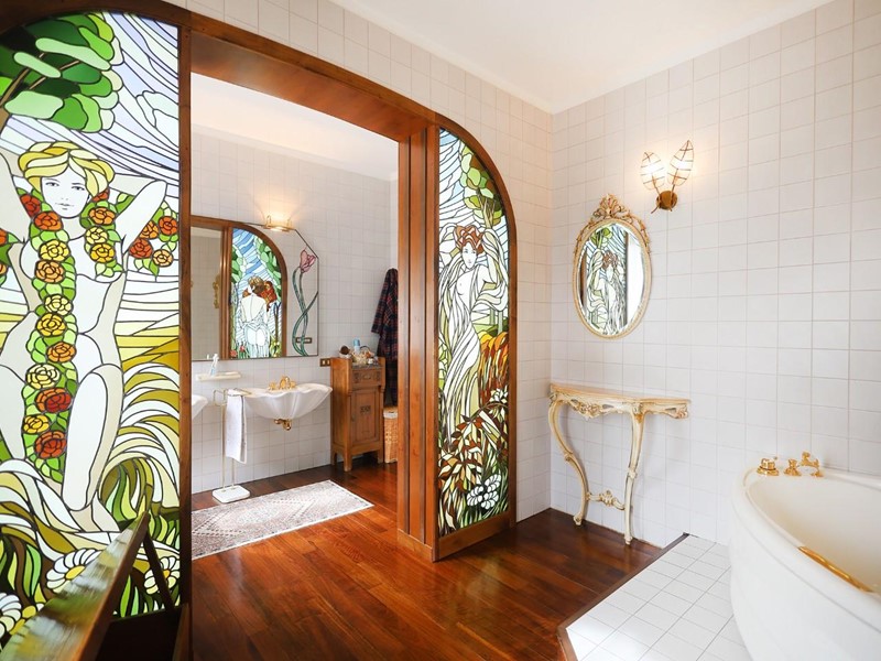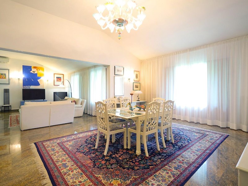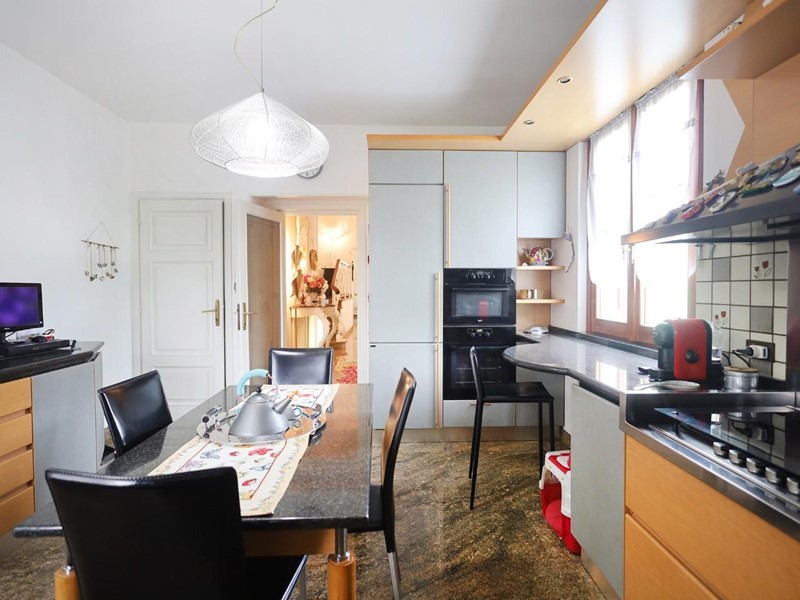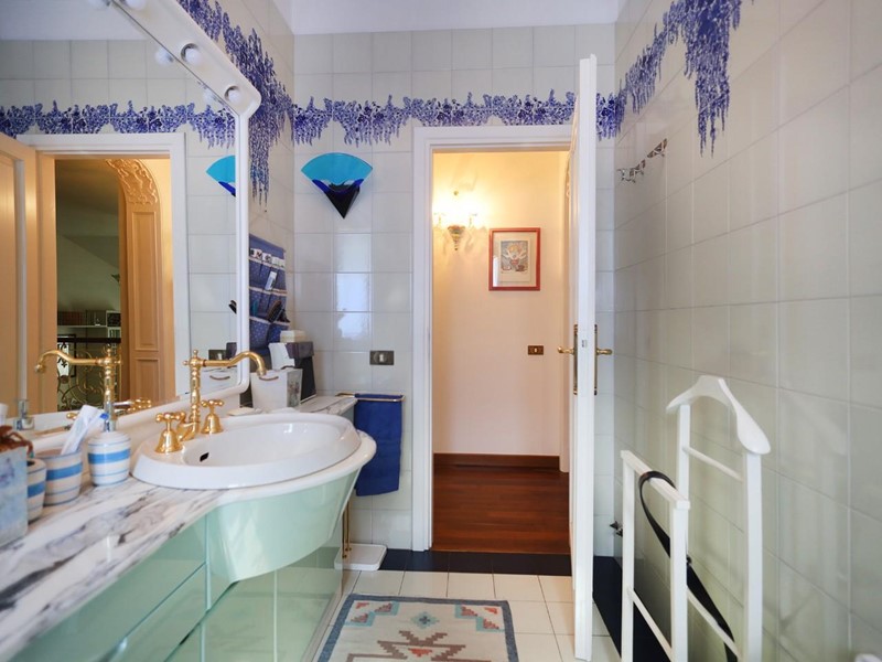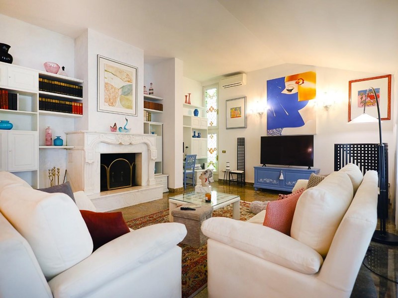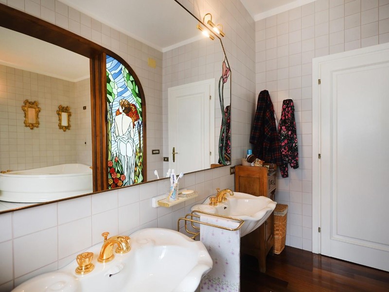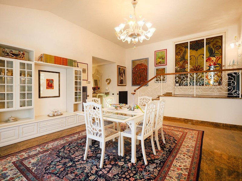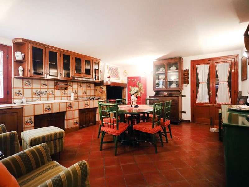 Al piano sottostante, ovvero al piano terra, vi sono una cucina rustica con camino ed uscita in giardino, un bagno, uno studio, un garage, tre cantine ed una centrale termica.
