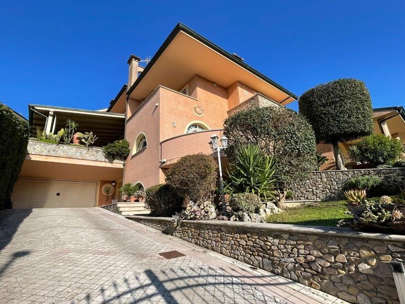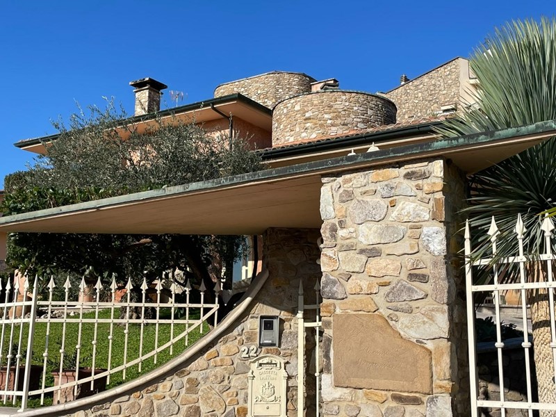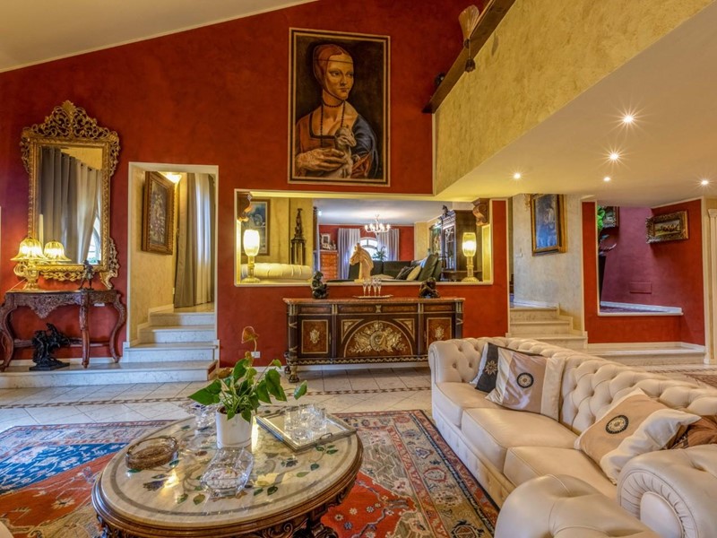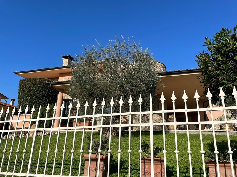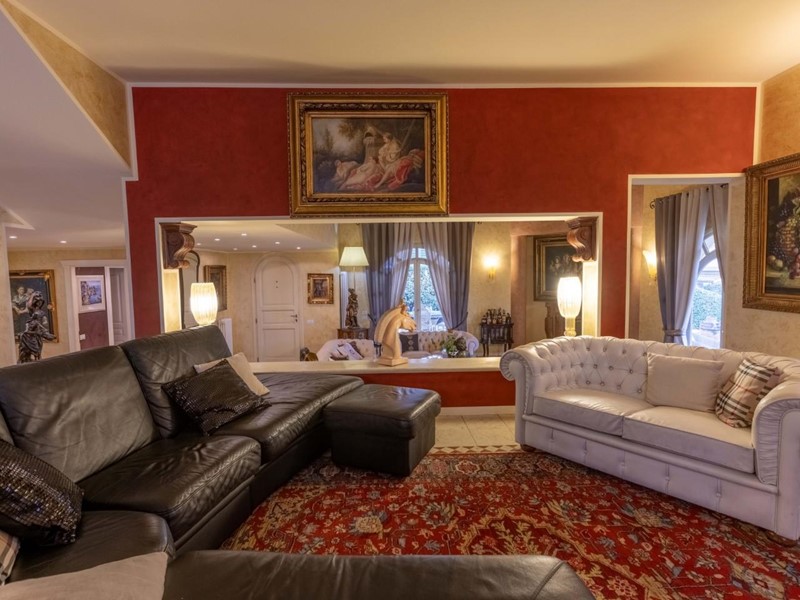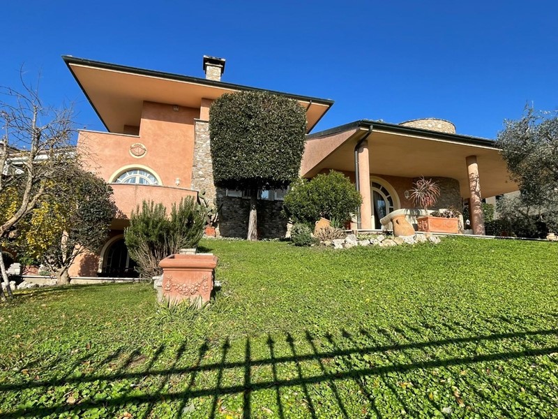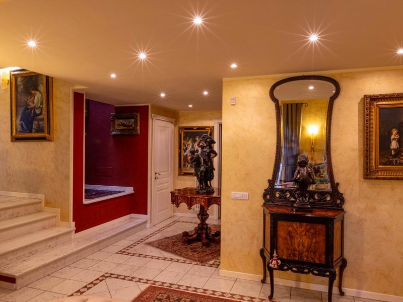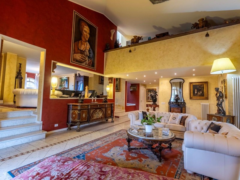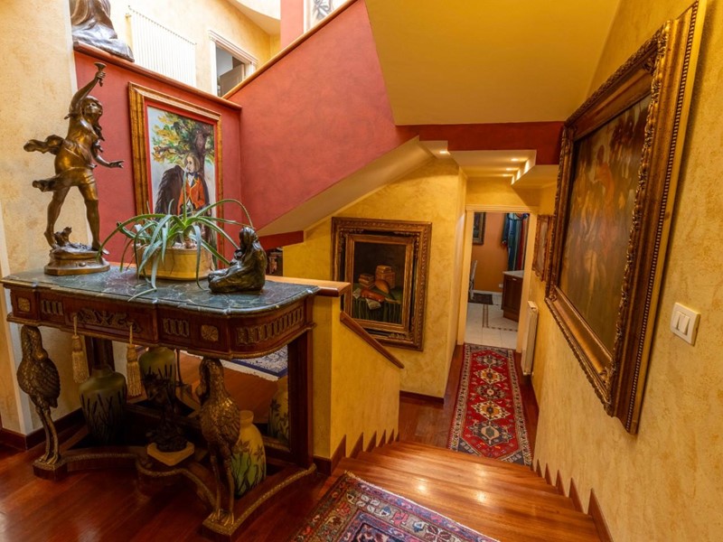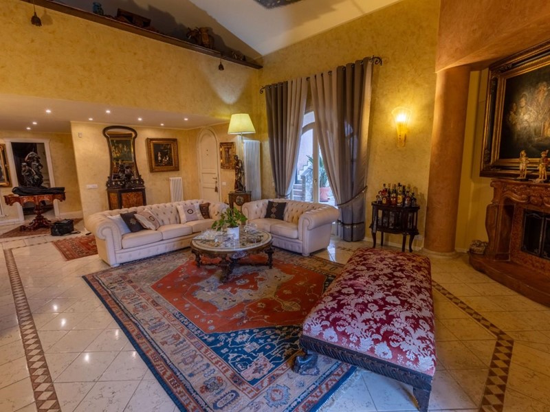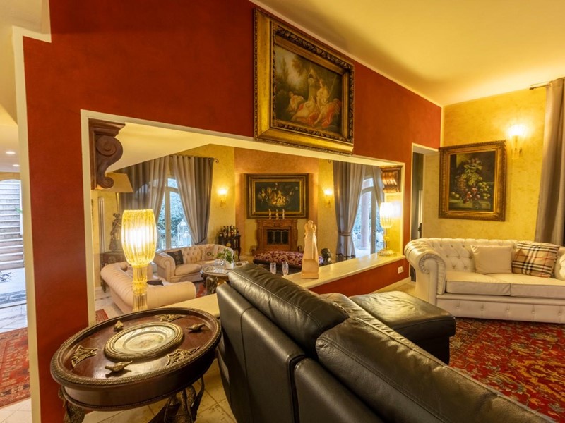 La villa è in ottimo stato, con ambienti curatissimi, ed offre, al piano terra (210 mq. circa), ampi spazi living aperti sul giardino e sotto una loggia, con un ingresso/soggiorno in parte a doppio volume, con caminetto e soffitto decorato, salotto/pranzo, cucina, disimpegno, due bagni e camera da letto. Il piano superiore (140 mq. circa), pavimentato a parquet, ospita altre tre camere da letto ed altrettanti bagni. Mansarda con terrazzo. di 20 mq. Al piano seminterrato (285 mq. circa compresi i garage) è stata ricavata una spaziosa taverna, anch’essa aperta sul giardino, caratterizzata dalla presenza di un grande camino in pietra, oltre a bagno e locali di sgombero. La villa è predisposta già con vano ascensore, non è installato l'apparecchio.