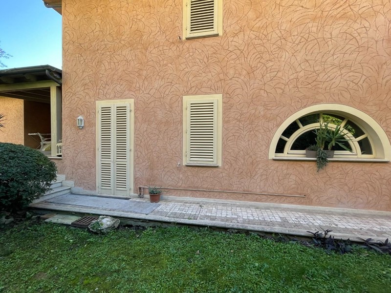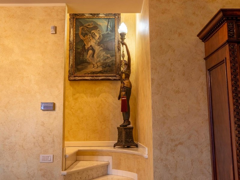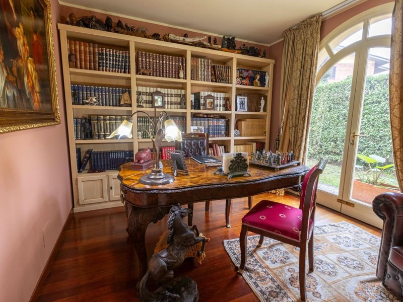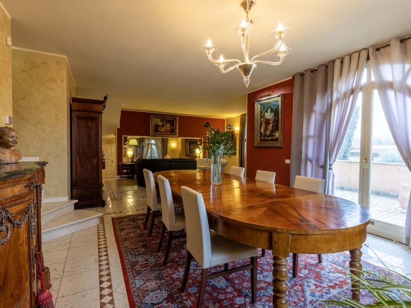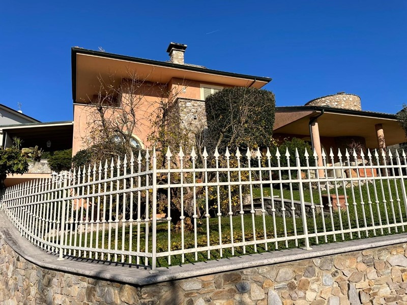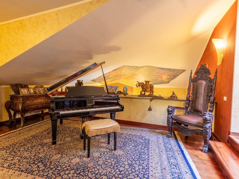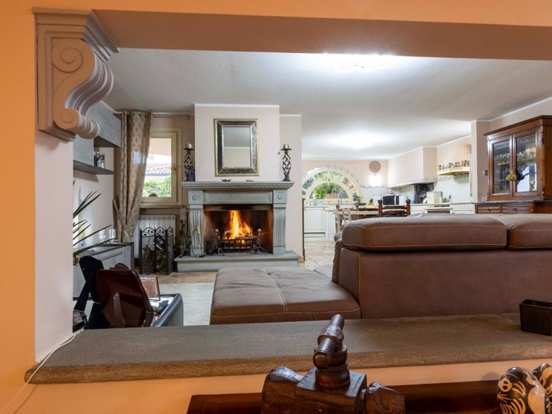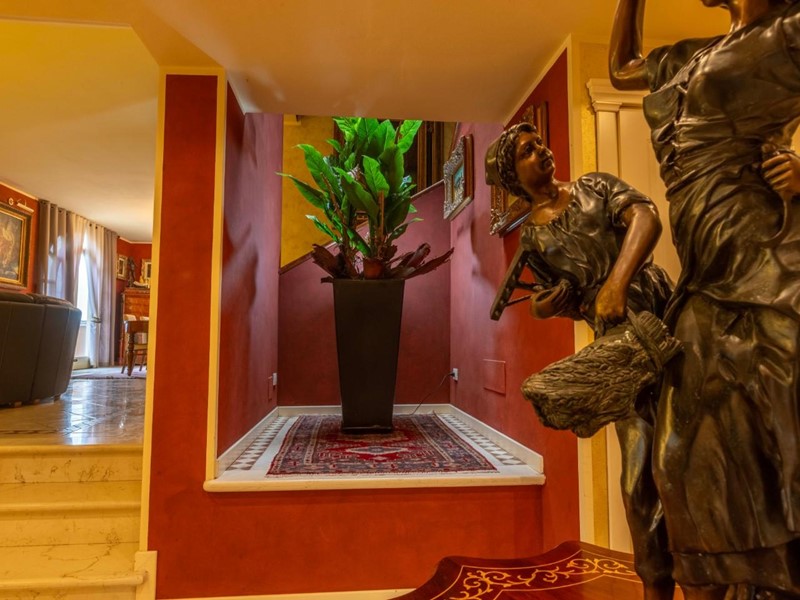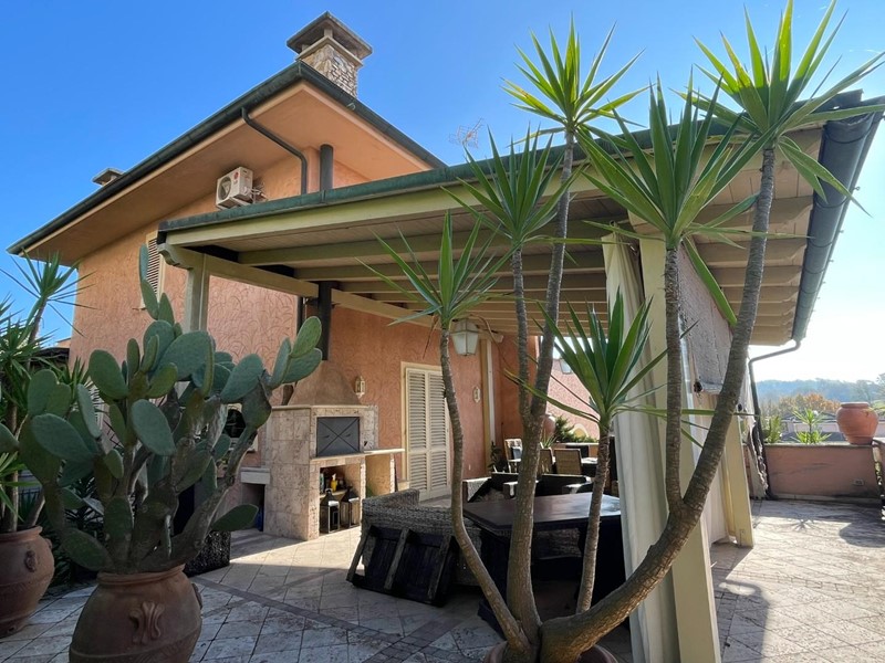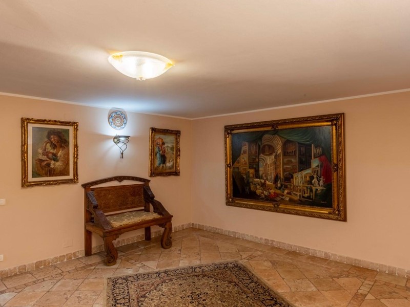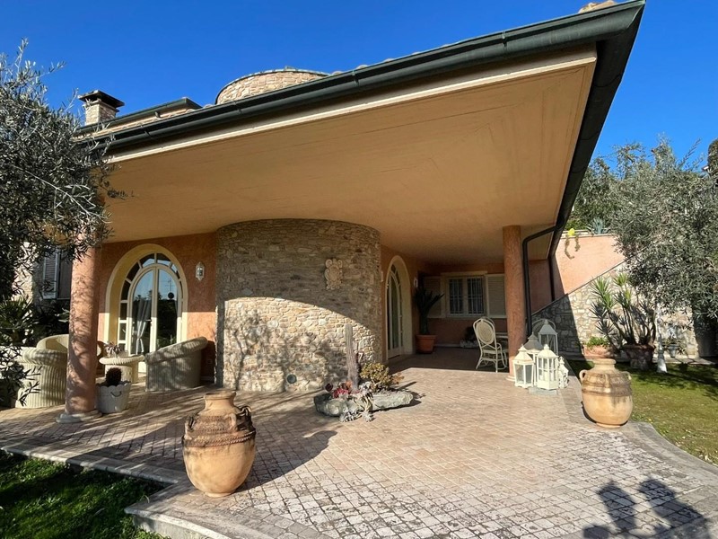 La villa è in ottimo stato, con ambienti curatissimi, ed offre, al piano terra (210 mq. circa), ampi spazi living aperti sul giardino e sotto una loggia, con un ingresso/soggiorno in parte a doppio volume, con caminetto e soffitto decorato, salotto/pranzo, cucina, disimpegno, due bagni e camera da letto. Il piano superiore (140 mq. circa), pavimentato a parquet, ospita altre tre camere da letto ed altrettanti bagni. Mansarda con terrazzo. di 20 mq. Al piano seminterrato (285 mq. circa compresi i garage) è stata ricavata una spaziosa taverna, anch’essa aperta sul giardino, caratterizzata dalla presenza di un grande camino in pietra, oltre a bagno e locali di sgombero. La villa è predisposta già con vano ascensore, non è installato l'apparecchio.