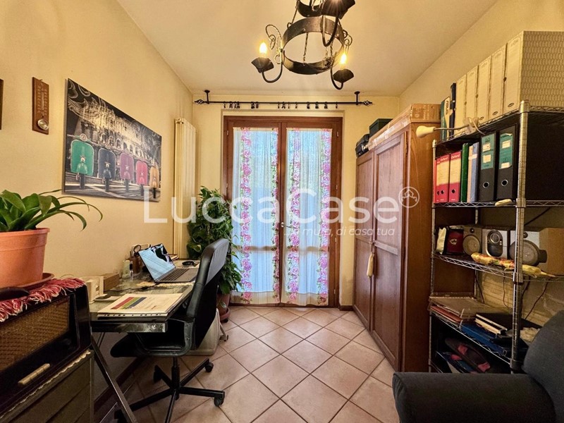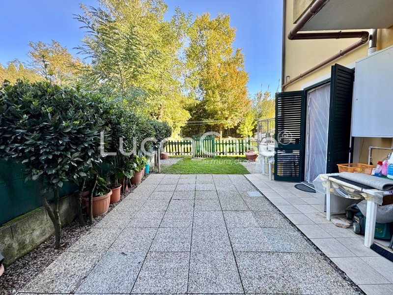 L'ingresso si apre direttamente sulla zona giorno composta da un unico ambiente soggiorno-cucina. Dalla cucina, una porta finestra conduce su una piccola resede pavimentata. Un disimpegno distribuisce la zona notte dove troviamo il bagno principale, un secondo servizio, la camera matrimoniale e una seconda camera più piccola utilizzabile anche come studio. Le due camere, tramite due porte-finestre, portano nella seconda resede (oggi pavimentata, ma facilmente convertibile a giardino) più grande e di proprietà esclusiva.