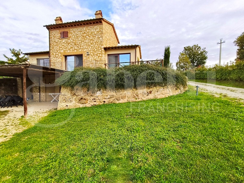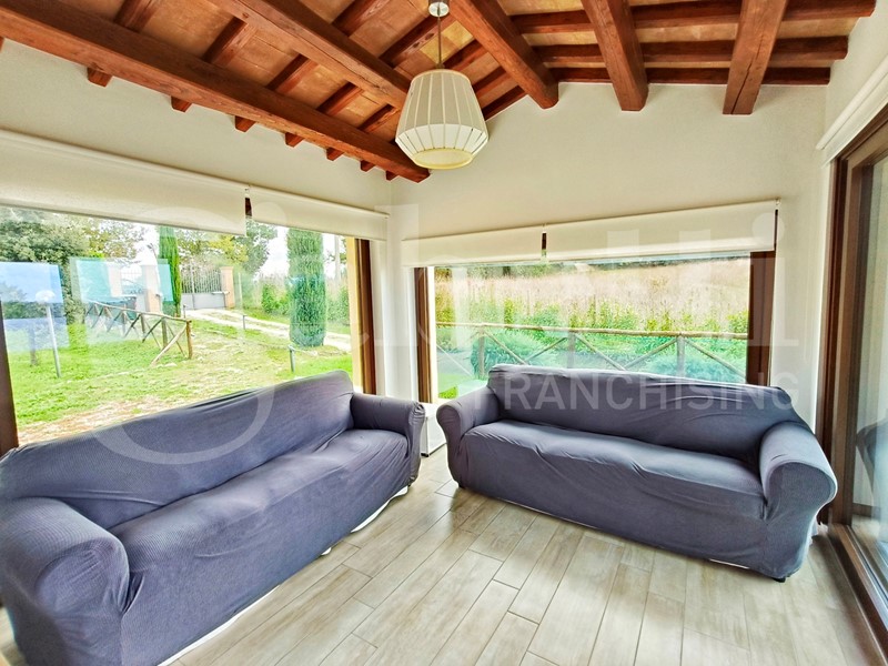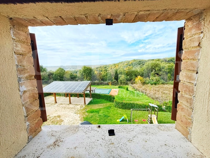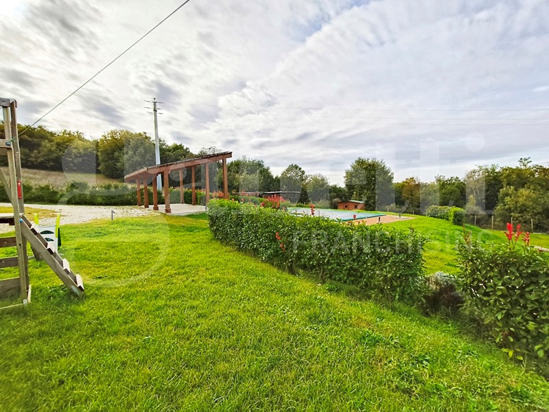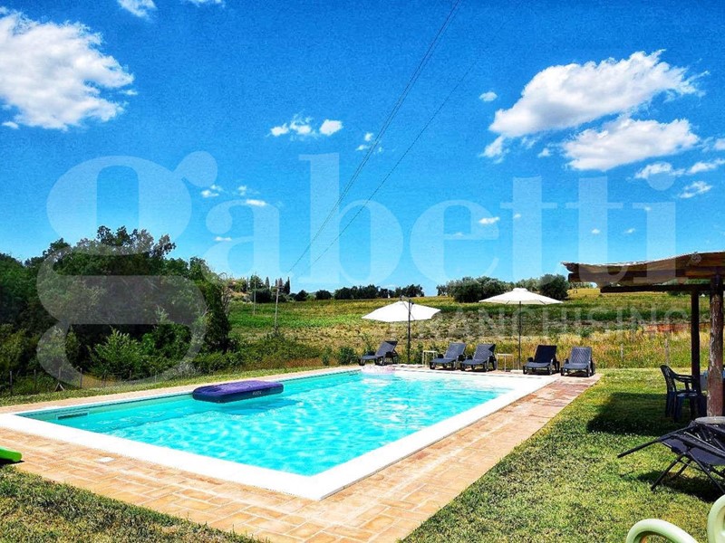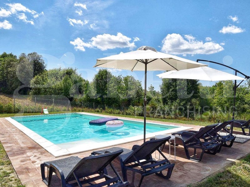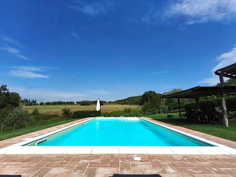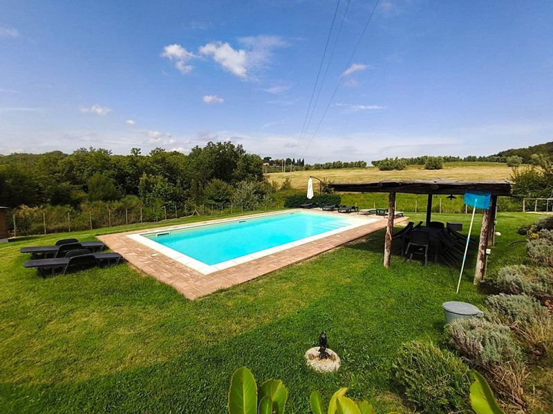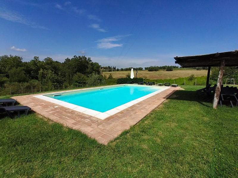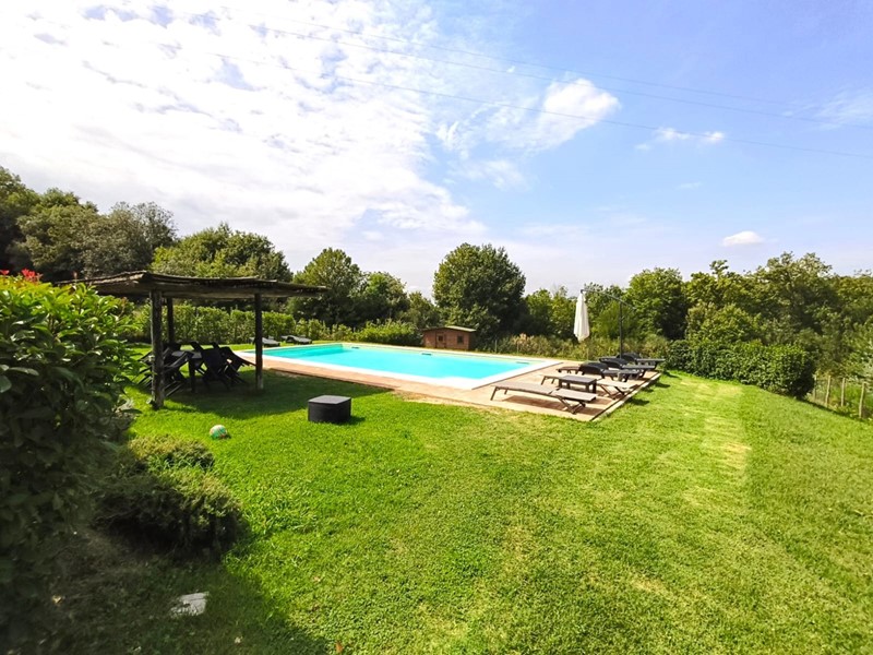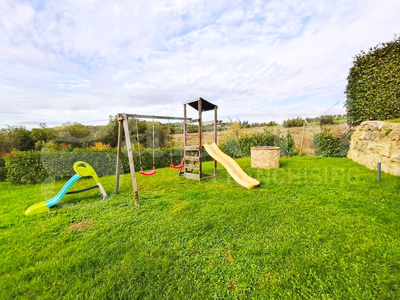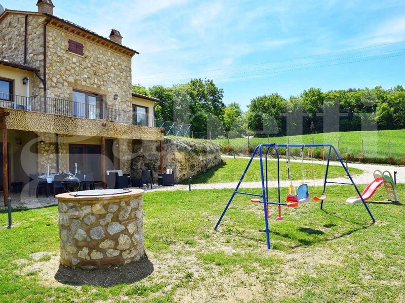 La proprietà è circondata da un curato giardino con spazio giochi per bambini, due pozzi e una piscina di mt. 10,5x5, ideale per momenti di relax e svago.
