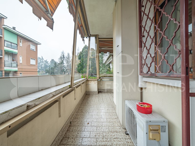 ingresso, cucina abitabile con terrazzo verandato che confina con la cameretta, soggiorno con balcone che collega alla camera matrimoniale, ripostiglio e due bagni.