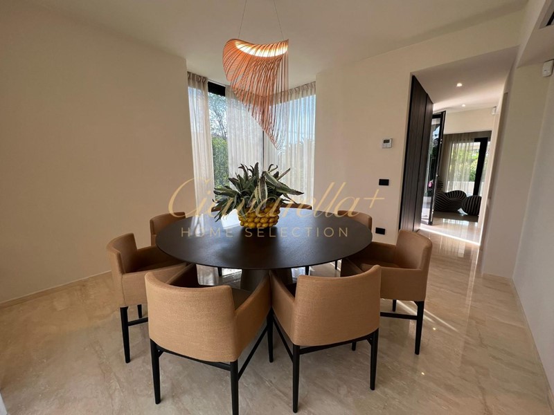 La cucina abitabile è completamente attrezzata e dotata di tutti i comfort necessari. La villa dispone di 5 camere da letto e 6 bagni, tutti finemente arredati e curati nei minimi dettagli.