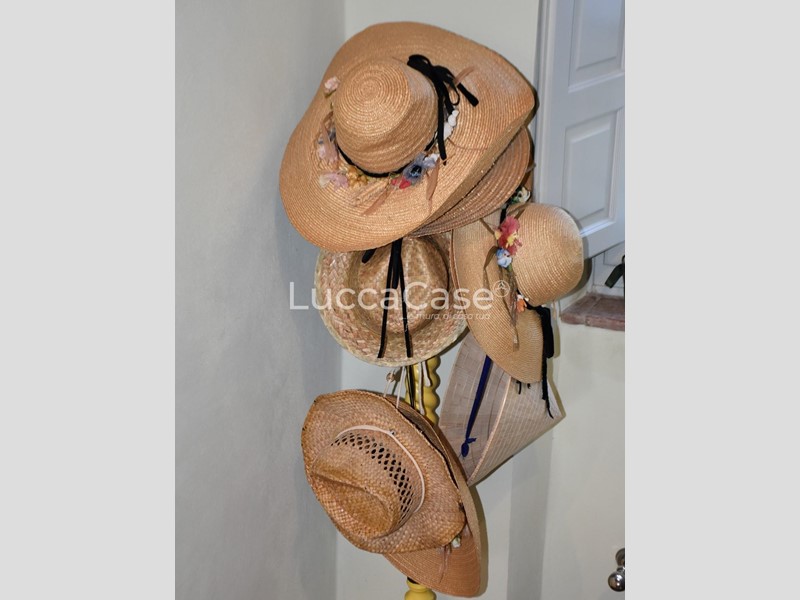 La scala in pietra serena con la ringhiera in ferro raccorda i due piani dell’abitazione ed è abbellita da una collezione di cappelli in paglia che fa mostra su un antico appendi abiti.