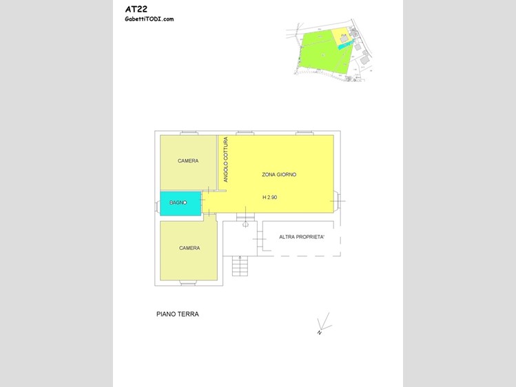 L'accesso, tramite 5 scalini esterni che conducono al pianerottolo in comune con l'altro appartamento, introduce direttamente nel salone con cucina a giorno e sala da pranzo con caminetto. Attraverso un piccolo disimpegno si accede quindi alla zona notte, composta da 2 camere e al bagno con doccia.