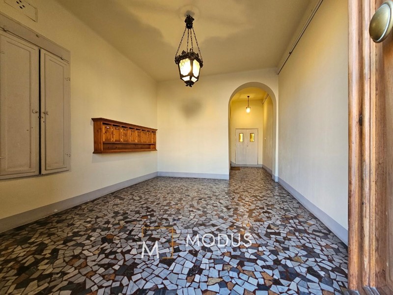 Le finiture curate sono visibili nelle pavimentazioni in legno e nelle eleganti porte interne, che conservano il fascino storico dell'edificio.
