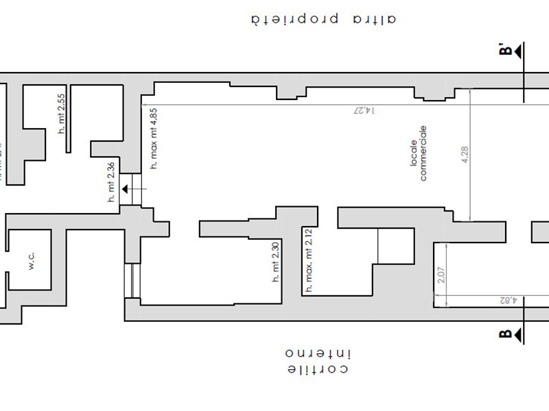 è sviluppato su una superficie catastale di circa mq. , è composto internamente di uno spazioso ambiente vendita all'ingresso, ben cinque stanzini (camerini), un locale deposito ed un bagno con anti-bagno. Al suo interno il locale presenta buone rifiniture e presenta una pavimentazione in gress, il tutto in ottimo stato. Grazie alla posizione altamente commerciale, il locale è adatto per innumerevoli attività commerciali, dalla vendita al dettaglio ai servizi.
