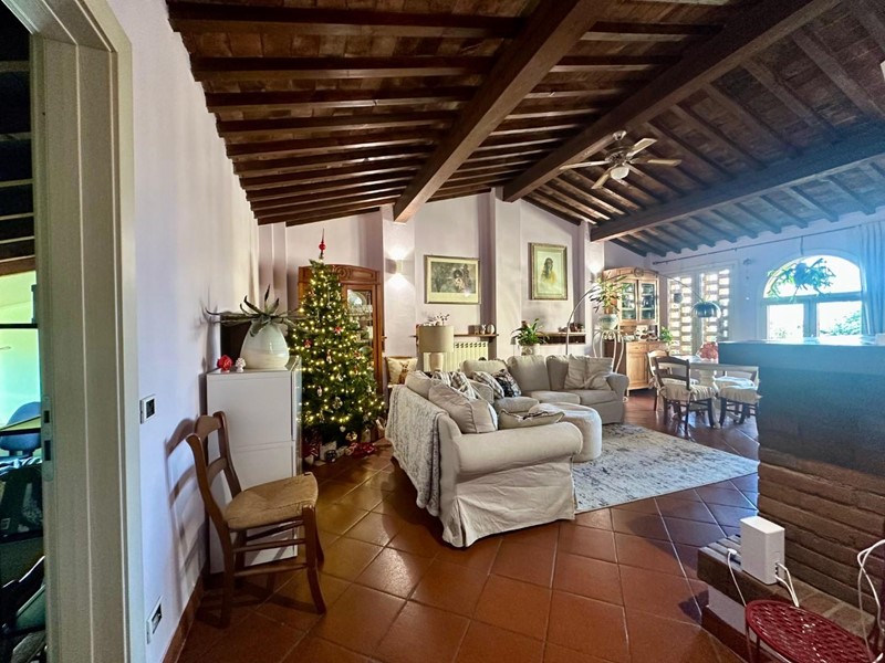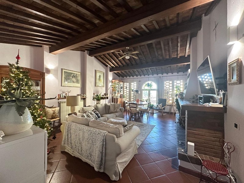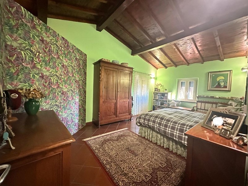 Al primo piano accediamo tramite vano scale che è collegato sia al piano terra dal predetto appartamentino che tramite accesso indipendente esterno con porta blindata, caratterizzato da una spaziosa e luminosa zona soggiorno open space con ampio camino, cucinotto con dispensa, un disimpegno, ripostiglio finestrato adibita a cameretta, bagno con doccia e al piano mezzanino camera matrimoniale