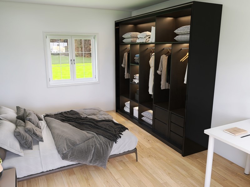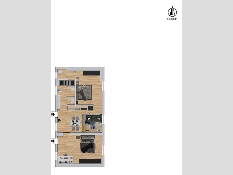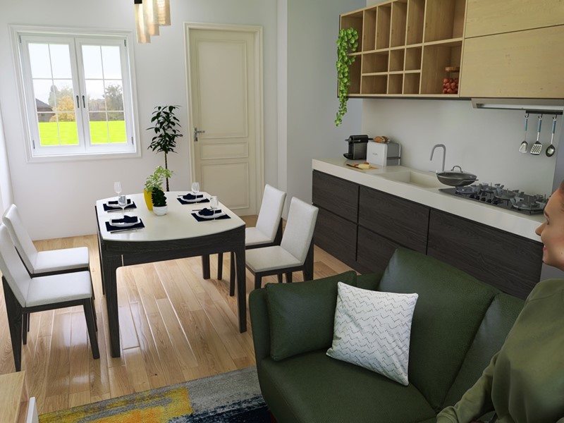 - 84 MQ ottimizzati grazie alla pianta quadrata, disposti con cucina a vista, in zona notte due camere e due bagni.