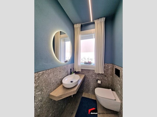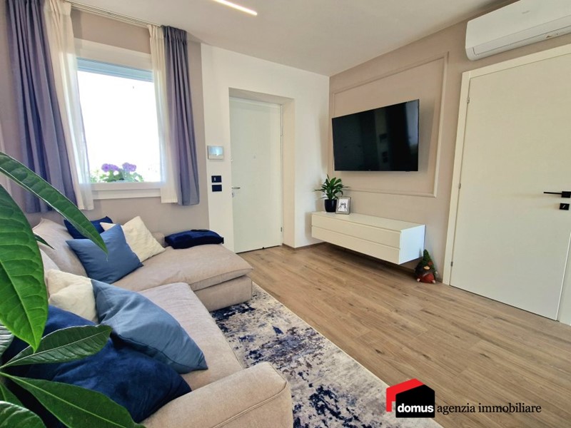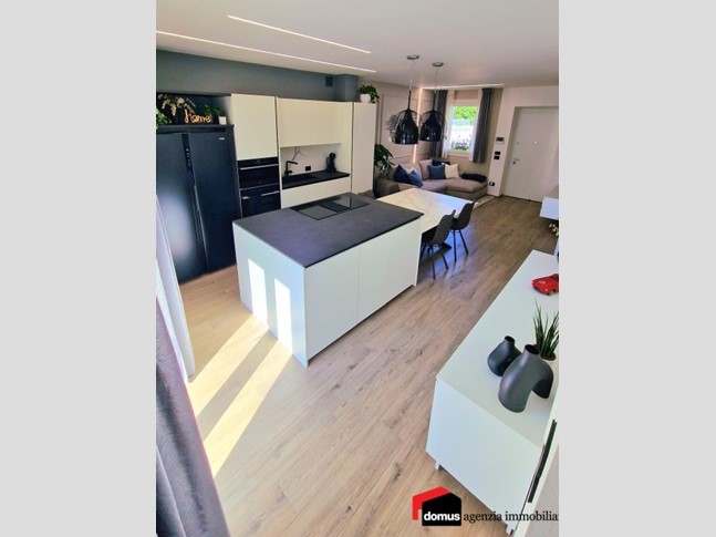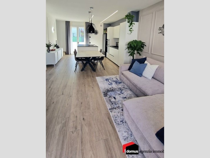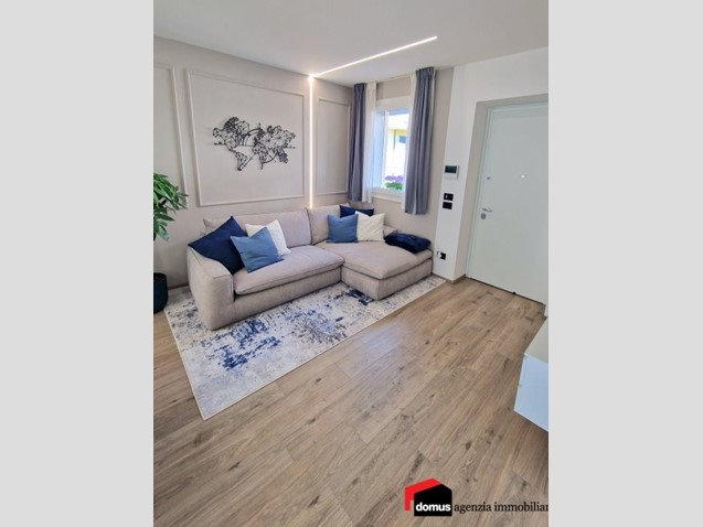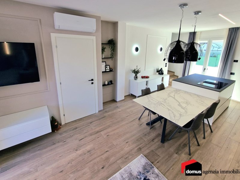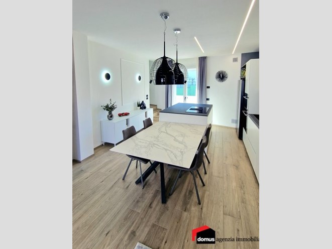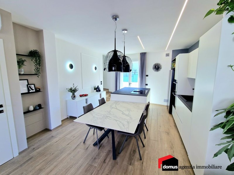 Thiene limitrofi: meravigliosa VILLETTA A SCHIERA DI TESTA inserita all'interno di una zona residenziale molto tranquilla di recente edificazione, lontana da strade trafficate, e dotata di parco giochi per bambini e percorsi naturalistici tra il verde.\nLa villetta si compone di ingresso indipendente, luminosa zona giorno open space suddivisa in angolo salotto-Tv, area pranzo e zona cucina con isola dotata di accesso diretto al poggiolo; la zona giorno è servita da un comodo servizio finestrato. Al piano primo trovano collazione un ampio bagno finestrato con doccia e due comode stanze da letto, ciascuna dotata di proprio poggiolo. Al piano interrato ampio bagno con doccia completo di angolo lavanderia e garage doppio in parallelo dalle dimensioni molto generose (oggetto di benefici fiscali). Nessuna spesa condominiale trattandosi di un piccolo contesto di sole 4 unità abitative.\nLa villetta gode di una porzione di giardino antistante esclusiva in parte pavimentata e viene consegnata eventualmente anche completa di arredo interno studiato a misura in ogni minimo dettaglio, dal gusto contemporaneo e dalla qualità indiscussa (illuminazione dimerabile, cucina PET con elettrodomestici Whirpool, piano a induzione Nicola Tesla con cappa filtrante, porte rototraslanti, ect. ect.).\nLe finiture curate in ogni dettaglio, assicurano confort e comodità: termostato in ogni stanza, serramenti con triplo vetro e doppia camera, tapparelle smart, zanzariere, basculanti sezionali, riscaldamento a pavimento, ect. ect.).\nQuattro buoni motivi per acquistare questo immobile:\n1. Piccolo contesto;\n2. Finiture di alto livello;\n3. Arredo completo;\n4. Zona molto tranquilla\n - Maggiori Dettagli: Climatizzato, Porta blindata, Predisposizione allarme