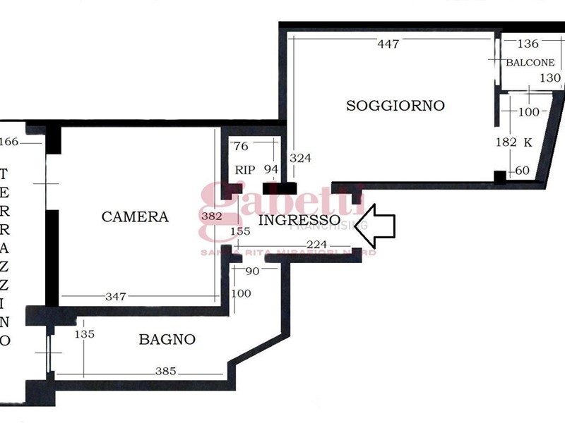 COMPOSIZIONE INTERNA: due arie di esposizione, ingresso, soggiorno con cucinino, camera da letto, ripostiglio, servizio, balcone e terrazzino. Cantina al piano seminterrato;