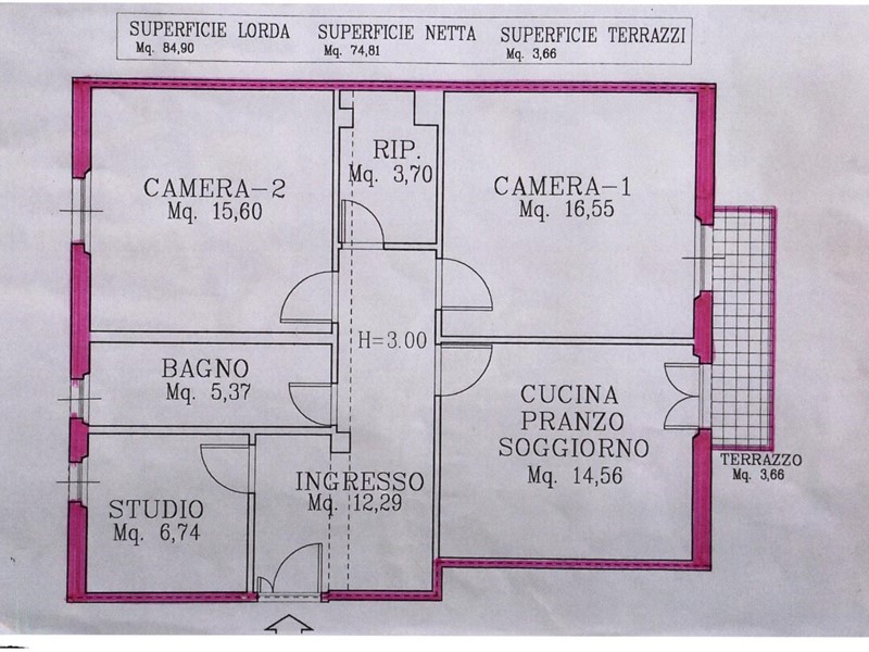 Borgaccio, in palazzina oggetto di ristrutturazione esterna intorno agli anni duemila, appartamento di 85 mq. , posto al terzo ed ultimo piano (senza ascensore) così suddiviso: ampio ingresso, soggiorno-cucina, disimpegno, due camere matrimoniali, studio, ripostiglio, bagno finestrato e terrazza. L'appartamento allo stato attuale non necessita di sostanziali interventi essendo stati rifatti gli infissi ( PVC ) e l'impiantistica di cucina e bagno intorno al 2006 compreso la caldaia.