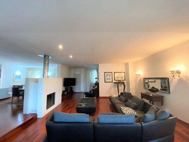 Entrando, sulla sinistra troviamo una cucina spaziosa, un doppio soggiorno diviso da un caminetto a legna bifacciale e uno studio/ufficio. Sempre in entrata ma sulla destra, troviamo il primo bagno.