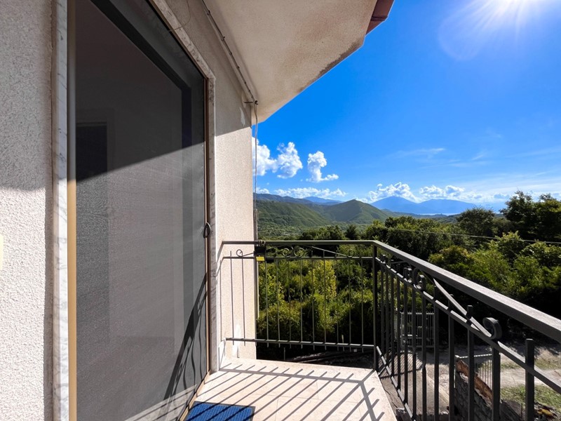 Il piano primo offre un soggiorno con camino e balcone panoramico, una cucina, tre camere da letto e un bagno.