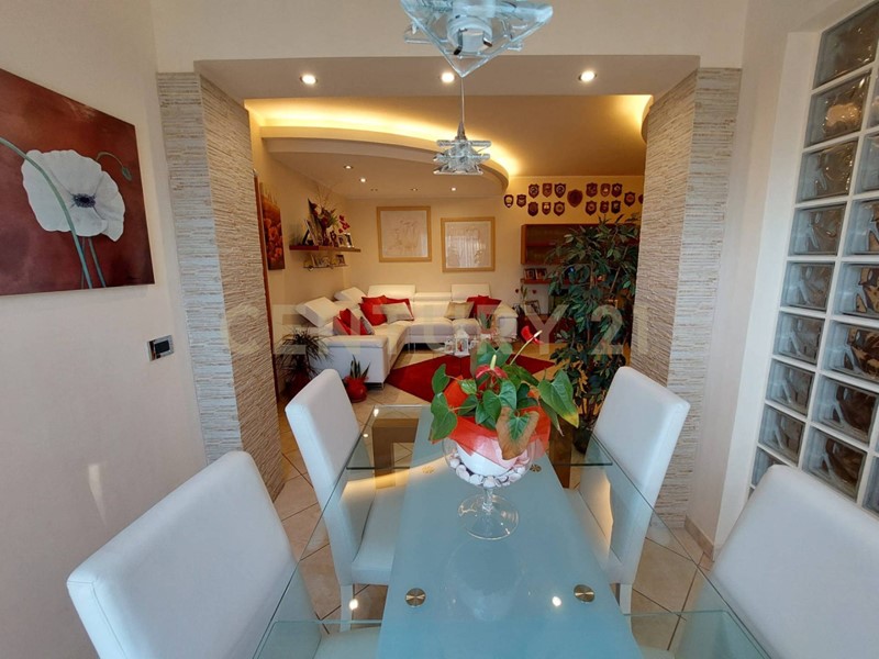 L' immobile colpisce fin da subito per la bellezza e la cura dei dettagli. Ci accoglie un bel soggiorno con dei soffitti particolari, realizzati in parte con cartongesso per un bel gioco di luci, zona pranzo con vista sul verde, cucina separata abitabile con una bella finestra sulla zona cottura. Dal soggiorno si accede ad un bel terrazzo da cui si gode una bella vista panoramica sul verde circostante e sul paese. Proseguendo, incontriamo il disimpegno notte, da cui si accede al bagno con doccia, ad una bella e ampia camera matrimoniale e ad una cameretta doppia.