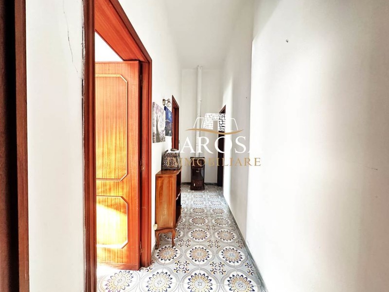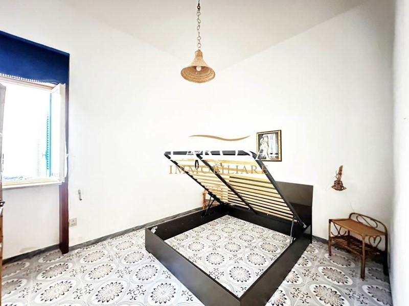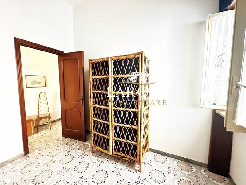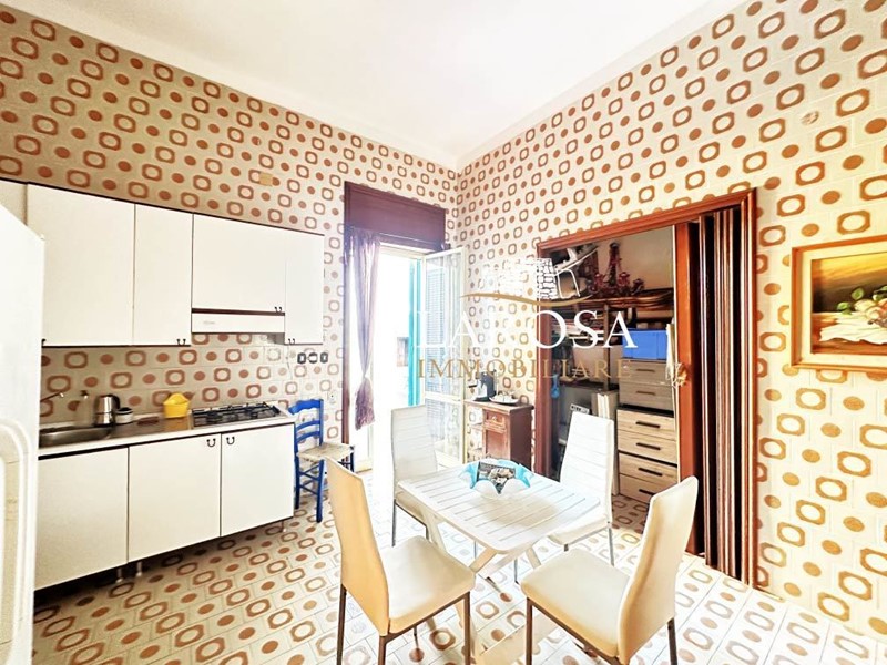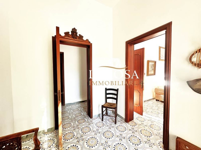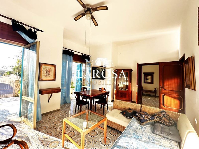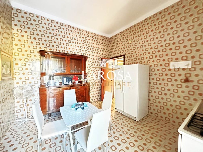 • A destra, si trova una spaziosa cucina abitabile, con disimpegno e porta-finestra che conduce al grande cortile retrostante, attrezzato per pranzi e cene all'aperto, con caminetto per cucinare. Una scala a chiocciola consente l'accesso alla splendida terrazza panoramica con vista sul mare.