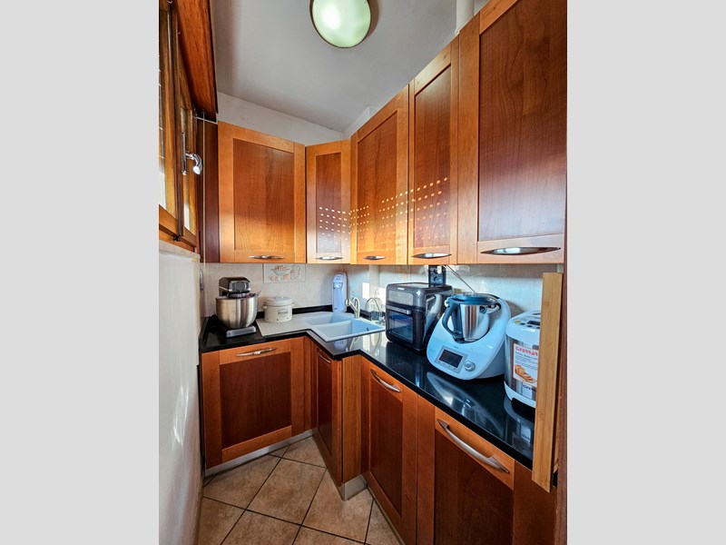 La cucina su misura con piano in marmo ha un'estensione nel ripostiglio accanto.