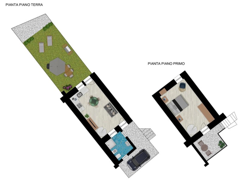 Composta al P.T. da ingresso su ampio soggiorno con angolo cottura, bagno, giardino privato di ca. 40 mq e  posto auto/ cortile.