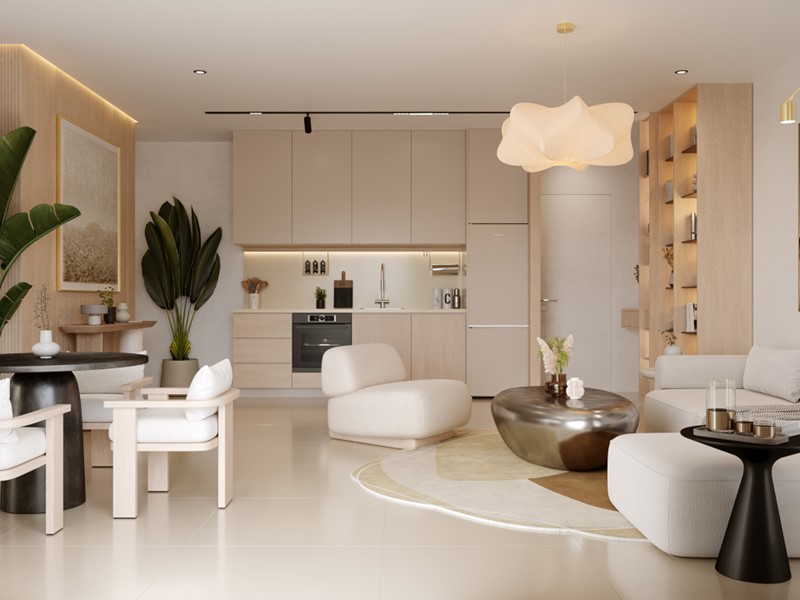 L'appartamento è composto da un ampio soggiorno con angolo cottura, una comoda camera da letto e un bagno. Le grandi finestre permettono di godere della splendida vista sul mare, regalando una sensazione di luminosità e tranquillità.