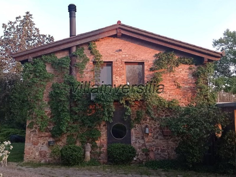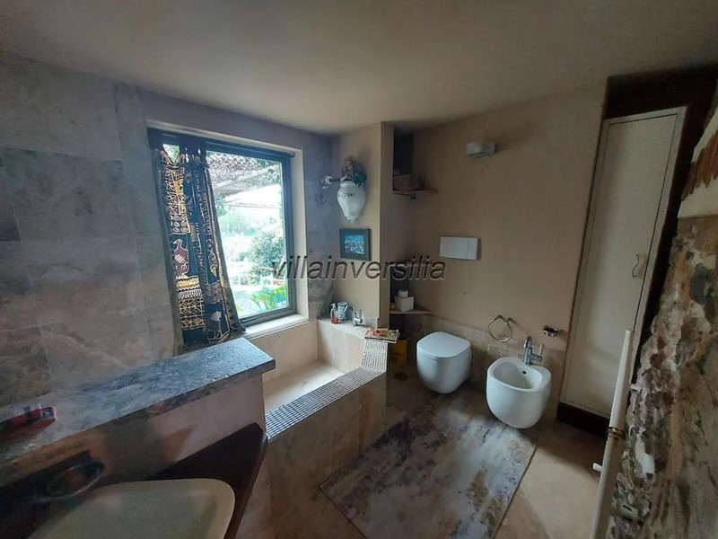 La casa e' su piu' livelli son piano terra / seminterrato con affaccio sul giardino attraverso grandi vetrate : con ampio soggiorno, cucina-pranzo, bagno e 2 vani con soffitti a volte , che erano un' antica cantina.