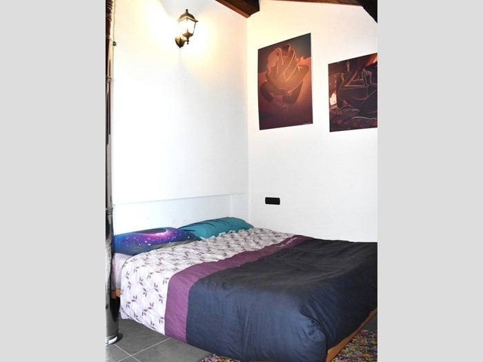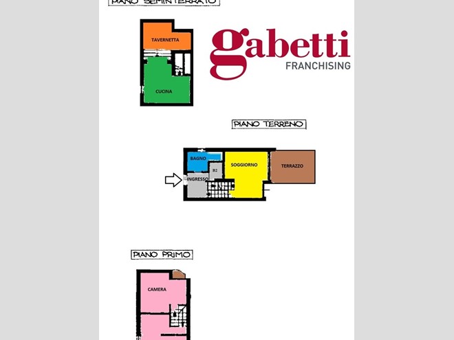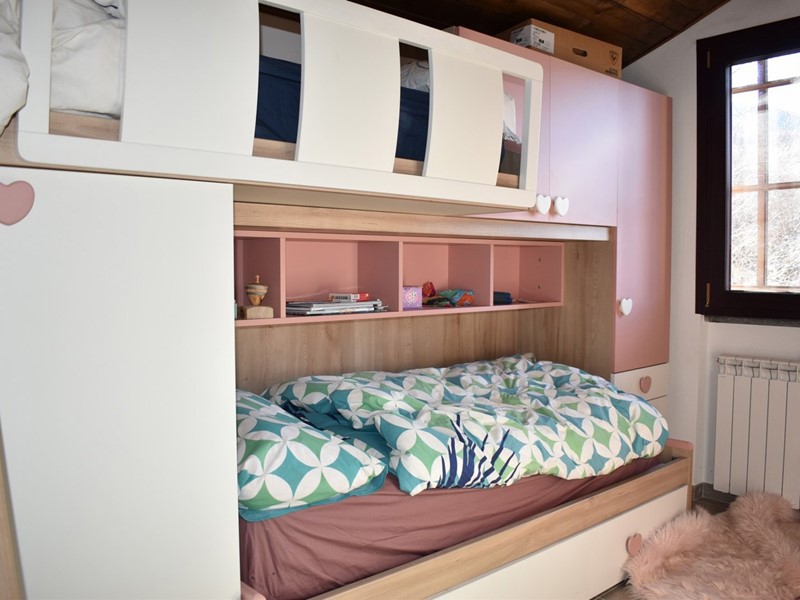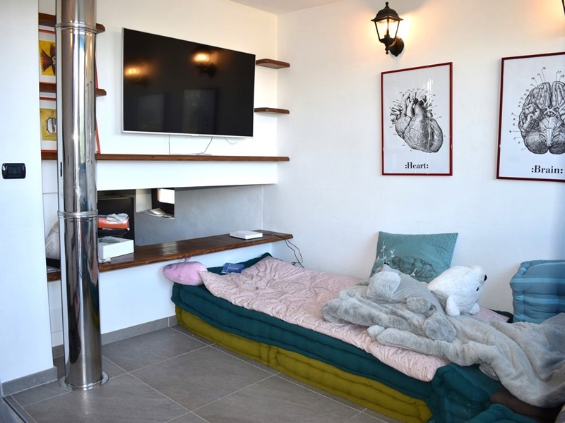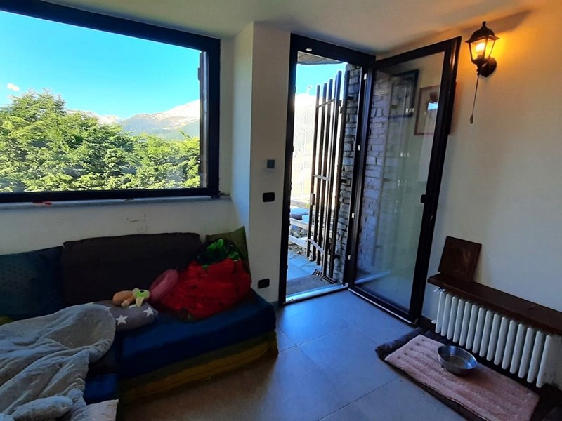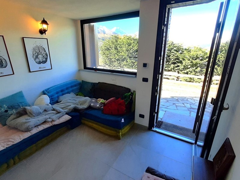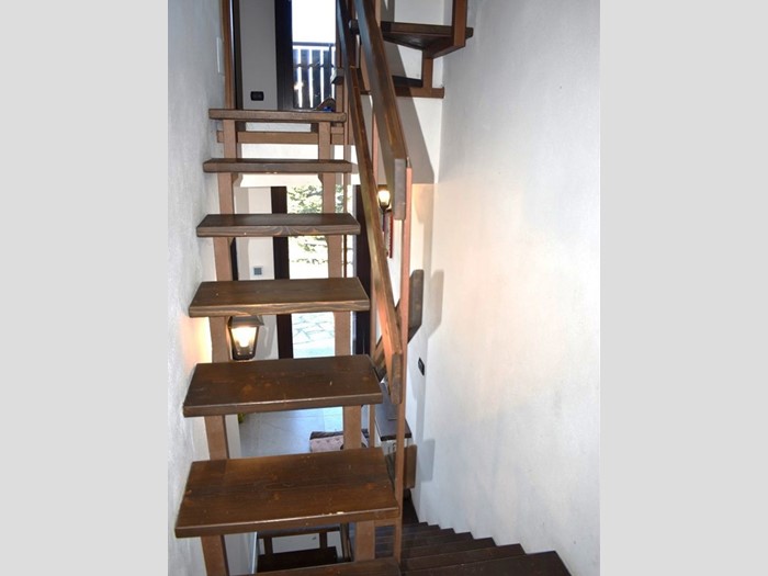 Al piano terra è composta da ingresso su disimpegno, bagno finestrato con doccia e bagnetto di servizio, salotto con affaccio sul terrazzino e vista panoramica sulla vallata, cucina e tavernetta con stufa a pellet collegate da una scala in legno. Al piano primo zona notte con 2 camere da letto.