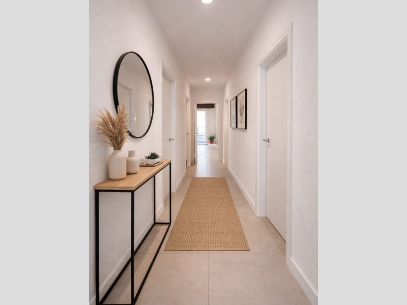 Ingresso indipendente, salotto e cucina open space, sottoscala/ ripostiglio, due camere da letto matrimoniali, corridoio, lavanderia/studio e bagno.