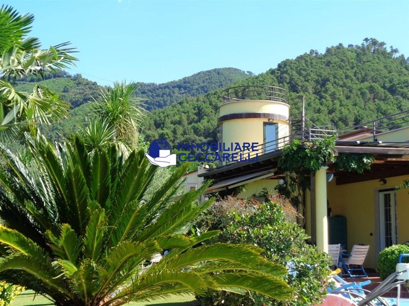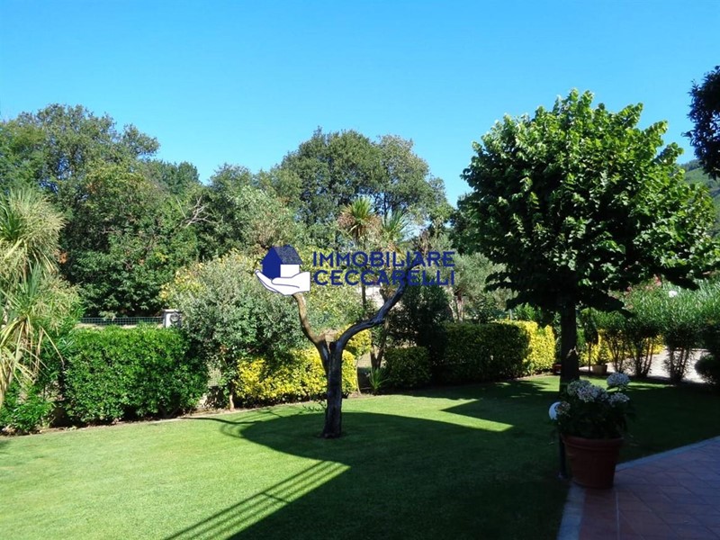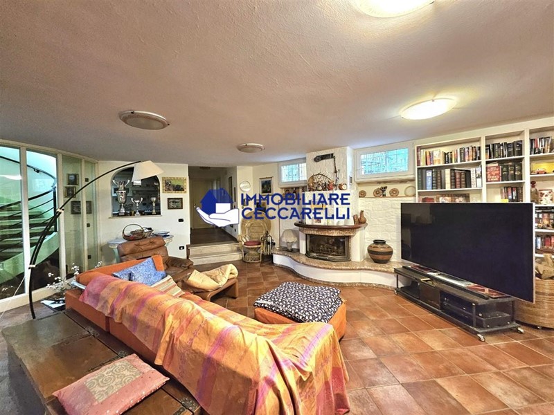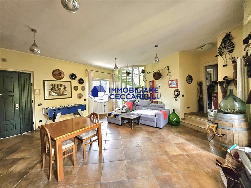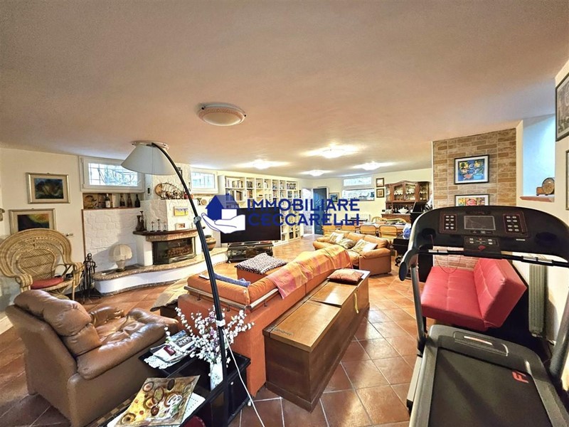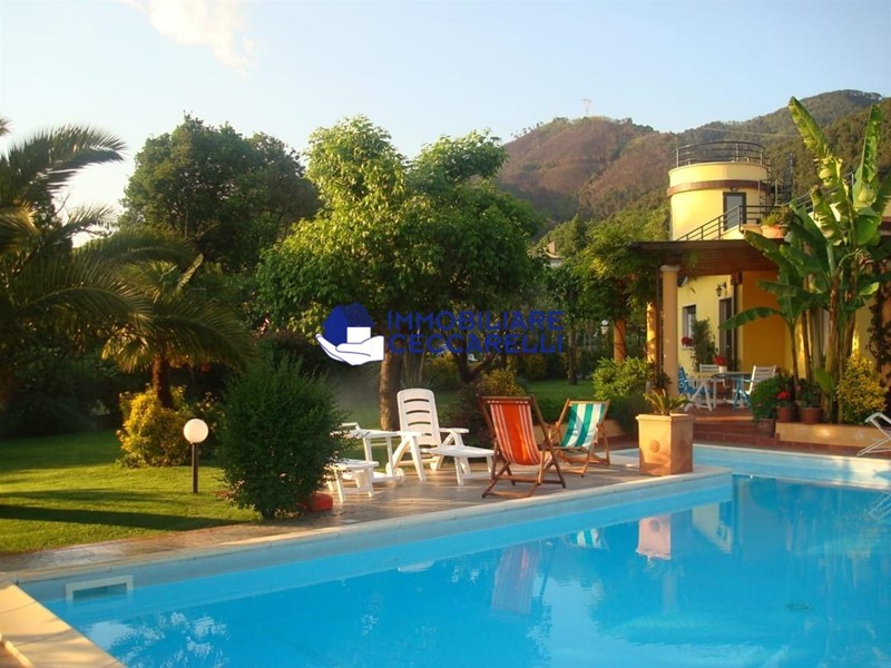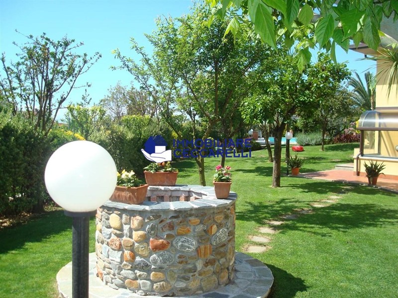 Circondata da un terreno di circa 2000 mq, l’abitazione è protetta da una recinzione adeguata e accessibile tramite un cancello motorizzato. L'ampio parcheggio pavimentato offre spazio per diverse autovetture. La villa si sviluppa su tre livelli indipendenti per una superficie di circa 300 mq. Composizione: • Piano Terra: un ampio ingresso conduce al luminoso salone-soggiorno. La cucina abitabile è collegata a una suggestiva pompeiana, ideale per momenti di relax, che si affaccia sulla piscina. Il piano terra ospita inoltre due eleganti bagni e cinque spaziose camere da letto. • Piano Seminterrato: un'accogliente taverna con camino offre l'ambiente perfetto per le serate invernali. Completano il piano un bagno, una lavanderia e comode cantine. • Piano Primo: una grande terrazza panoramica a tetto, con soffitta, consente di godere di una vista mozzafiato che spazia dalle verdi montagne al mare. Un'imponente e unica scala a spirale, circondata da una vetrata trasparente, collega i vari livelli, aggiungendo un tocco di design all'intera abitazione. Gli interni sono caratterizzati da un design moderno con una distribuzione spaziosa e dinamica che rende ogni ambiente unico. Esterni e Giardino: la piscina, situata nella parte sud della villa, domina la porzione più ampia del giardino. Il terreno è caratterizzato da un gioco di dislivelli che rende gli spazi esterni ancora più suggestivi e vivibili. Impiantistica e Finiture: la villa è dotata di impianti all’avanguardia in linea con le normative sul risparmio energetico. Il sistema termico ed elettrico trifase è supportato da un impianto fotovoltaico da 12 kWh con accumulo in batteria a litio da 21 kW e una caldaia ibrida a pompa di calore e metano.