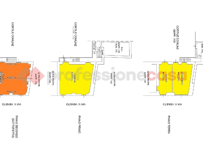 a) TERRATETTO di Corte A/3 con affaccio fronte strada così composto: APPARTAMENTO disposto su tre livelli di circa 45 mq cadauno (40 mq calpestabili) collegati tra loro da scala esterna e ballatoio di proprietà; i primi due livelli sono abitazione il terzo sottotetto al grezzo finestrato con altezza massima 3,75 mt. oltre a, SERVIZIO di circa 15 mq in corpo staccato. Impianto di riscaldamento funzionante a caldaia classica certificata con radiatori in alluminio. Tetto sostituito nel 1983. Solette i legno.
