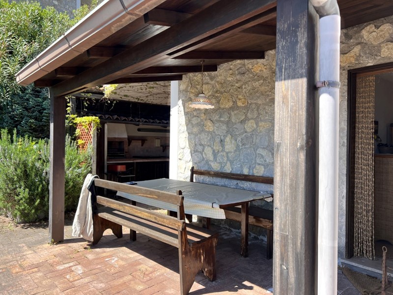 La zona esterna, situata a ridosso del giardino pensile, si presenta accessoriata con piano cucina, barbecue e tettoia in legno, perfetta per pranzare all'aperto, nonché particolare box doccia in muratura e piccolo ripostiglio.