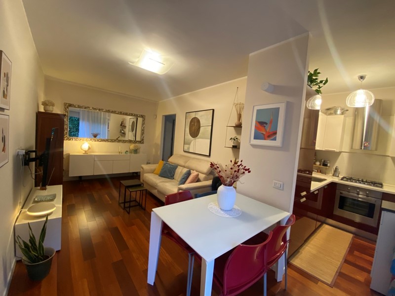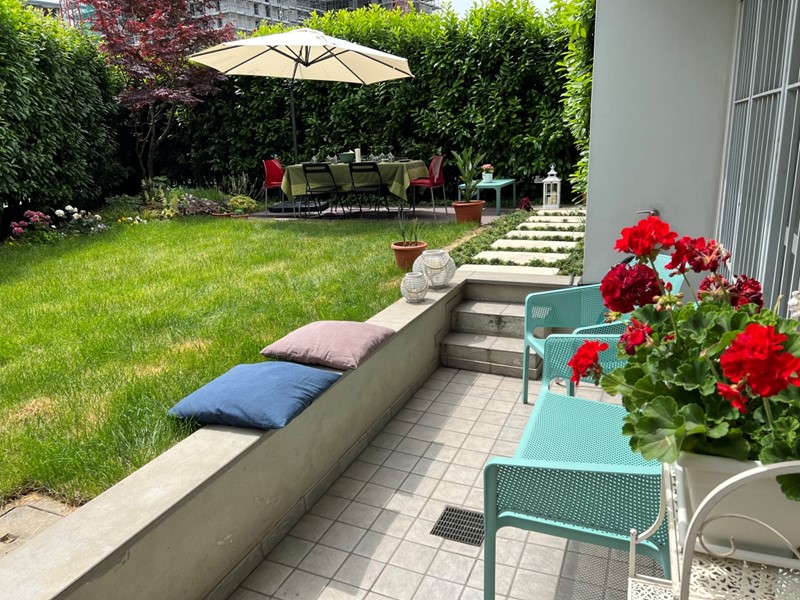 L'appartamento, che gode di un'ottima esposizione a sud est, risulta essere molto luminoso. Si compone di soggiorno con cucina e accesso diretto al giardino privato loggiato, disimpegno, camera da letto matrimoniale, cabina armadio e bagno finestrato.