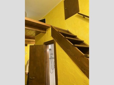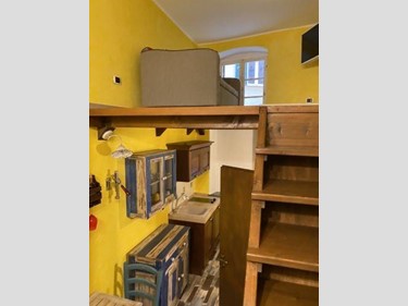 Entrando nell'appartamento troviamo una parete attrezzata con cucina con finestra, un angolo pranzo, un piccolo bagno con doccia, comode scale il legno portano ad un soppalco con finestra, dove è attrezzata la zona letto, ripostiglio.