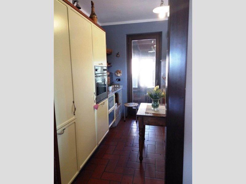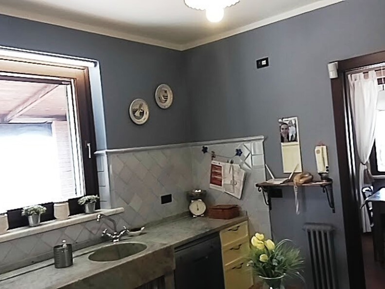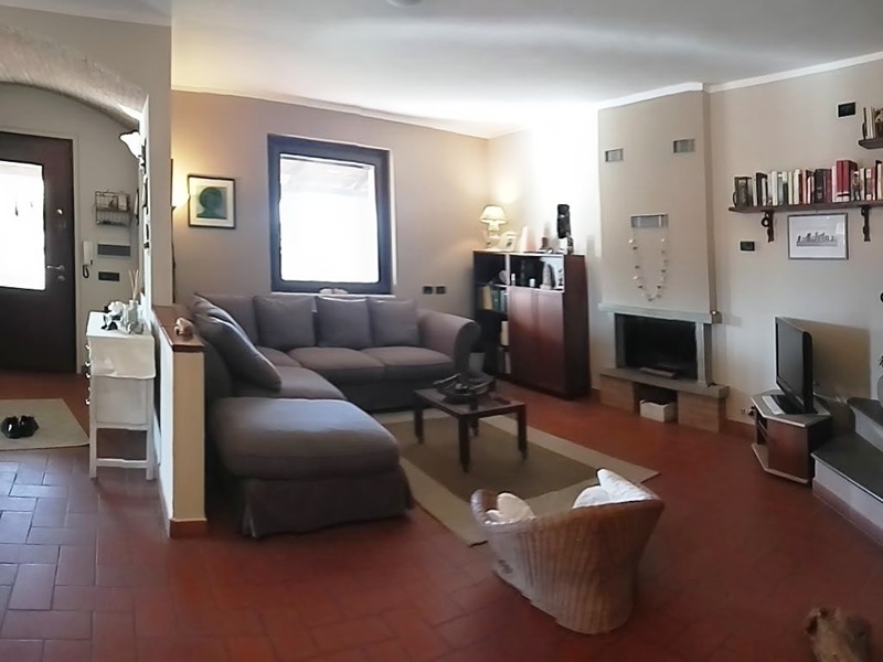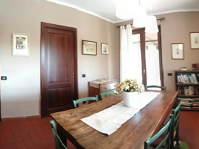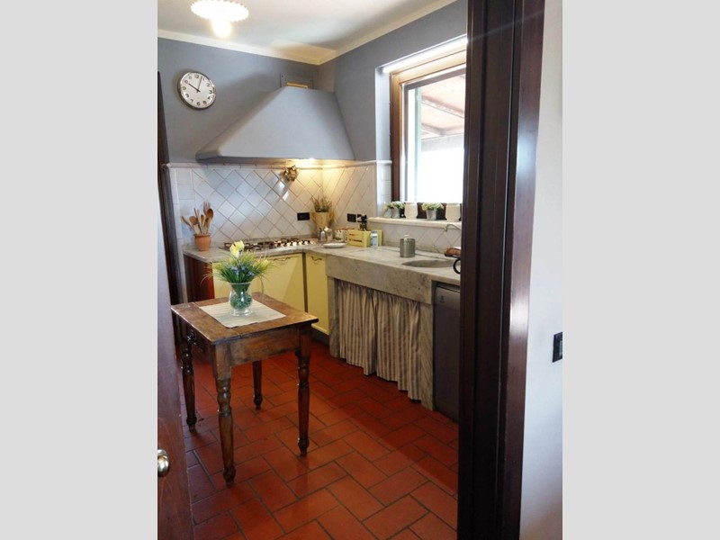 La proprietà è disposta su tre livelli, con ingresso al piano terra da patio in ampio soggiorno con camino, zona pranzo e cucina abitabile, bagno di servizio. Al primo piano camera matrimoniale con cabina armadio e accesso a balcone, una seconda camera e un ampio bagno con doccia e vasca. Al piano mansardato camera matrimoniale, cameretta/studio e un bagno finestrato con doccia. Cantina al piano seminterrato. Dal soggiorno si accede a zona pavimentata attrezzata con zona pranzo esterna + area relax e piscina. Ampio giardino e terreno coltivato con ulivi di circa 4.000 mq. Completano la proprietà box auto e area di parcheggio per 6 auto.