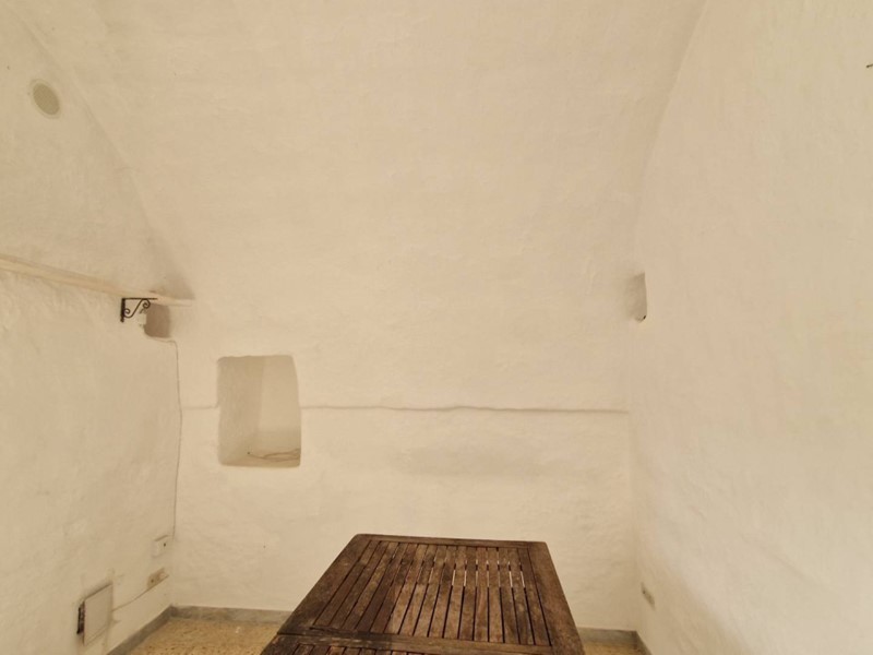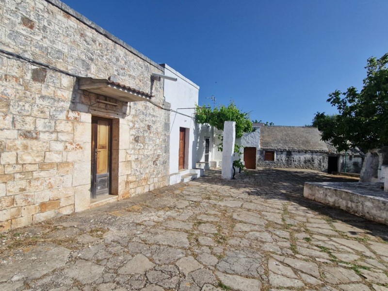 L'unità si compone di una zona a trulli (di mq 90 circa) composta da 4 coni, bagno e ripostiglio e un antico fabbricato adiacente e collegato (di mq 140 circa) composto da 4 ampi vani con volta a botte, bagno, antico focolare, grande magazzino, antica cantina e forno con anti forno. Il tutto con affaccio su caratteristica corte privata. Terreno agricolo di mq 2500 circa. Cisterna in comune.