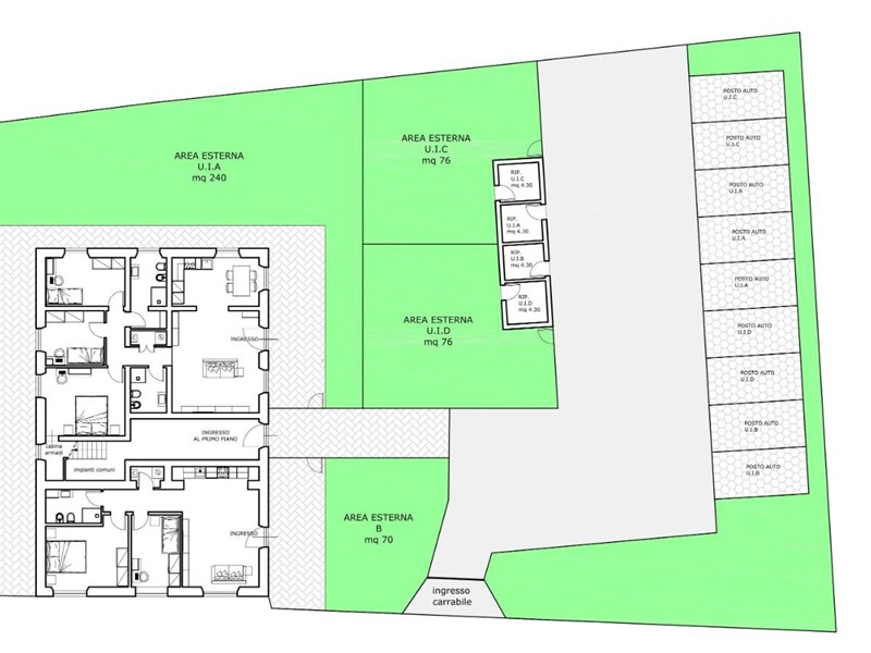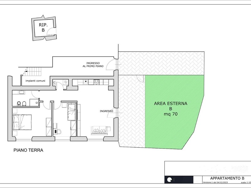 L'appartamento ha ingresso indipendente ed è composto da ingresso su soggiorno/ pranzo con angolo cottura, ripostiglio , camera matrimoniale , camera singola e bagno. L'appartamento è corredato da resede esclusiva di m² 85 in parte pavimentata, ripostiglio in muratura e due posti macchina nell'area comune.
