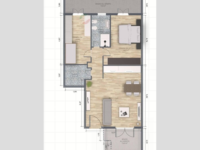 un comodo soggiorno di 30mq, 2 bagni, 2 comode camere e 2 terrazzi, uno nella zona giorno e l'altro nella zona notte.