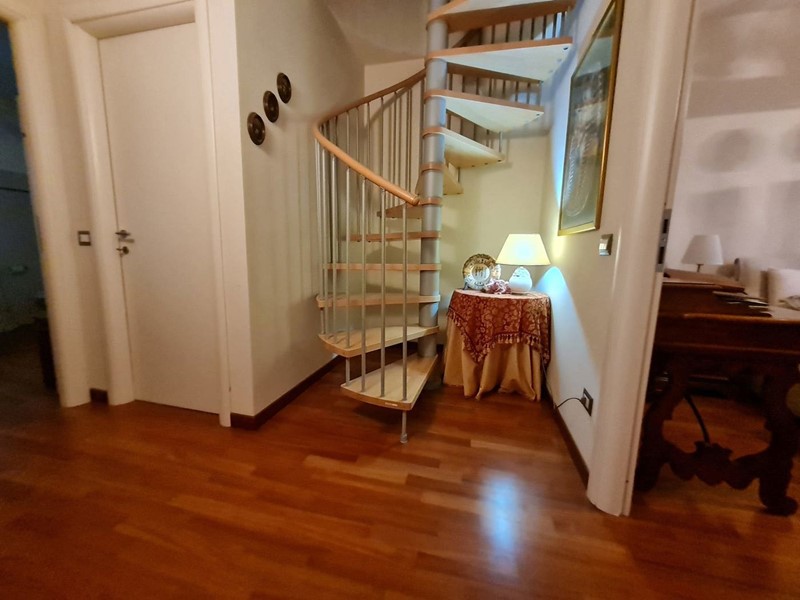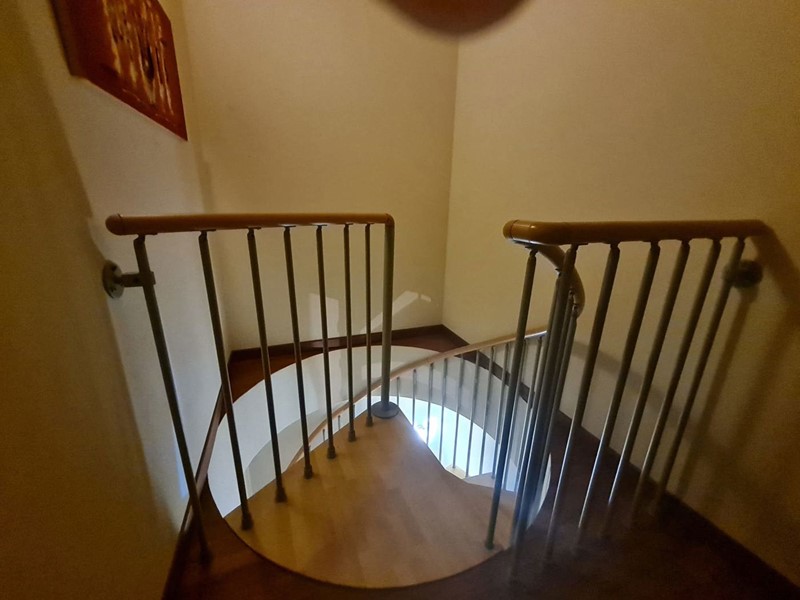 L'ultimo piano con travi a vista è collegato tramite una moderna scala a chiocciola.