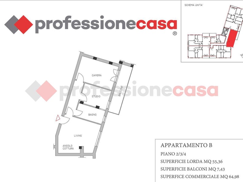 Tipologia TRILOCALE, composizione: ingresso in soggiorno con cucina a vista, camera matrimoniale, studio, bagno/lavanderia e balcone.