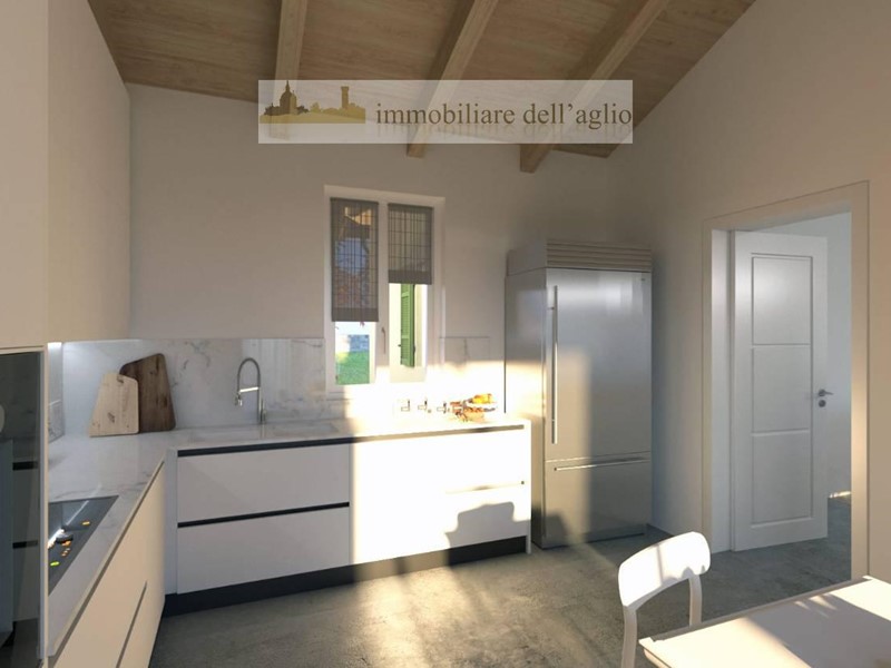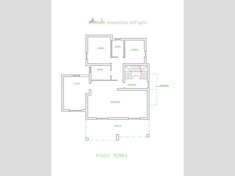 il piano terra è stato progettato per costruire una cucina abitabile, un ampio soggiorno dove due ampie vetrate si affacciano sulla panoramica vista della pianura. In questo piano si possono ricavare due bagni oltre a due camere matrimoniali. Un ampio portico antistante il soggiorno permette di porre un arredamento per il relax e un tavolo per pranzare e cenare nelle belle stagioni. Questo piano ha una superficie di 140 mq.