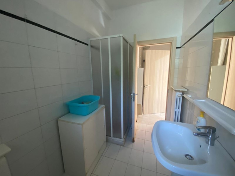 Piano rialzato monolocale con divano letto e altro letto una piazza e mezzo, bagno con finestra e cabina doccia